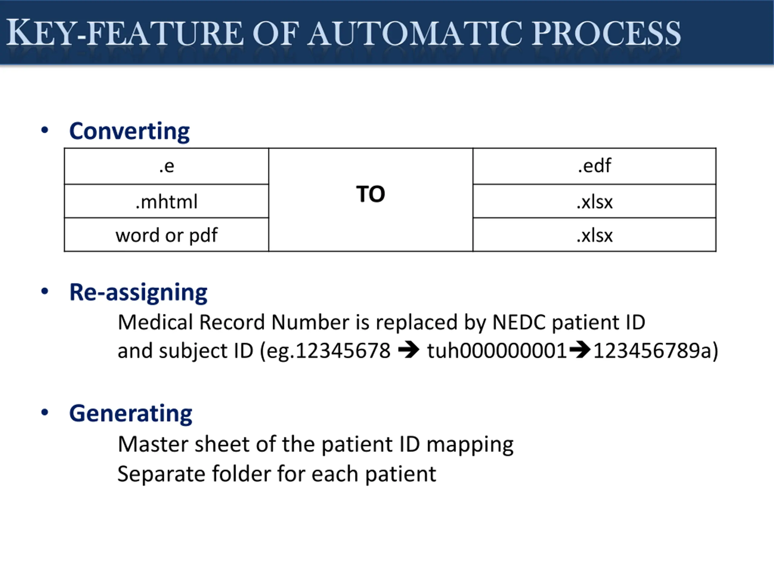 Converting .e .edf TO .mhtml .xlsx word or pdf .xlsx Re-assigning Medical Record Number is replaced by NEDC patient ID and subject ID (eg.12345678 tuh000000001 123456789a) Generating Master sheet of the patient ID mapping Separate folder for each patient
