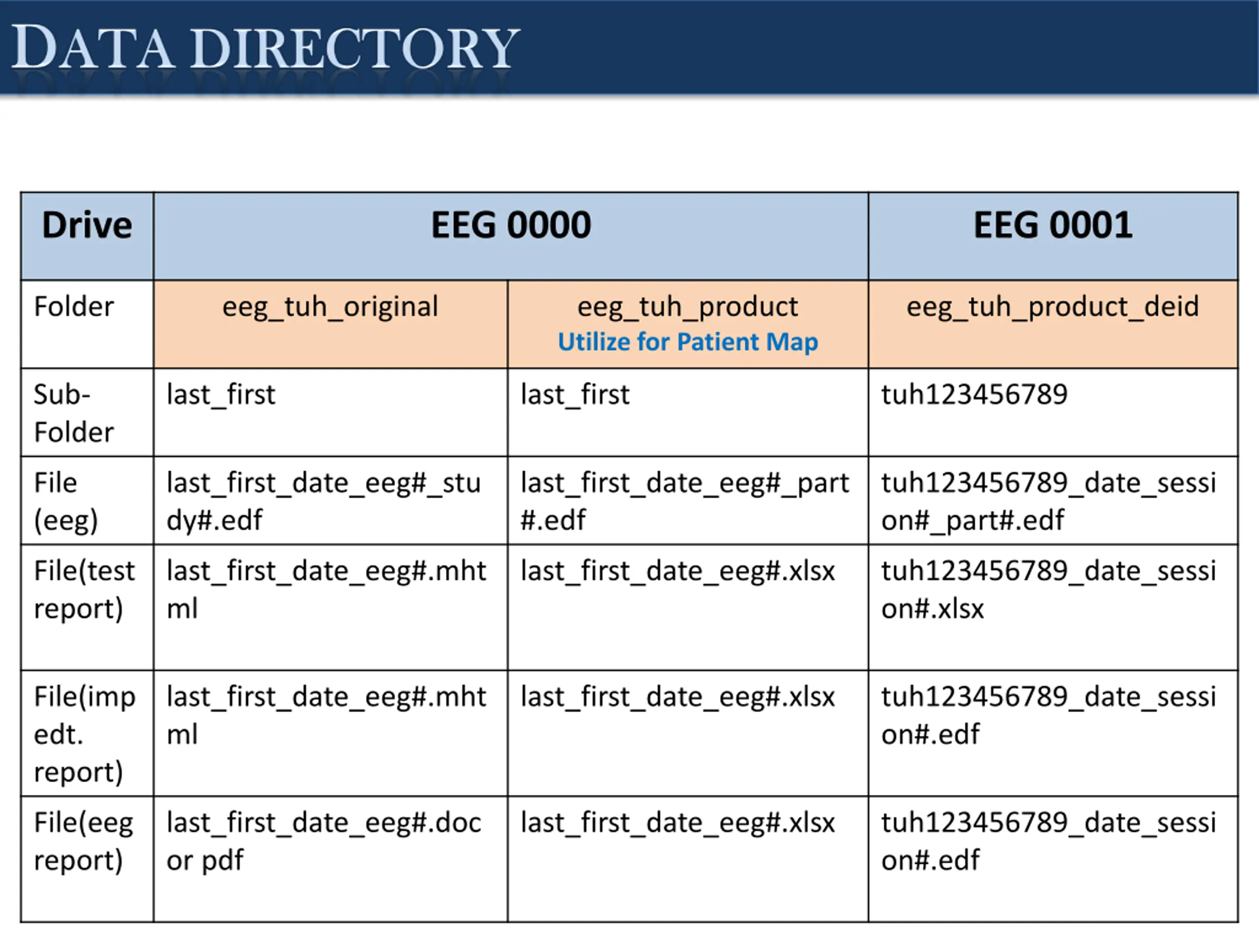 Drive EEG 0000 EEG 0001 Folder eeg_tuh_original eeg_tuh_product Utilize for Patient Map eeg_tuh_product_deid Sub- Folder last_first last_first tuh123456789 File (eeg) last_first_date_eeg#_stu dy#.edf last_first_date_eeg#_part #.edf tuh123456789_date_sessi on#_part#.edf File(test report) last_first_date_eeg#.mht ml last_first_date_eeg#.xlsx tuh123456789_date_sessi on#.xlsx File(imp edt. report) last_first_date_eeg#.mht ml last_first_date_eeg#.xlsx tuh123456789_date_sessi on#.edf File(eeg report) last_first_date_eeg#.doc or pdf last_first_date_eeg#.xlsx tuh123456789_date_sessi on#.edf