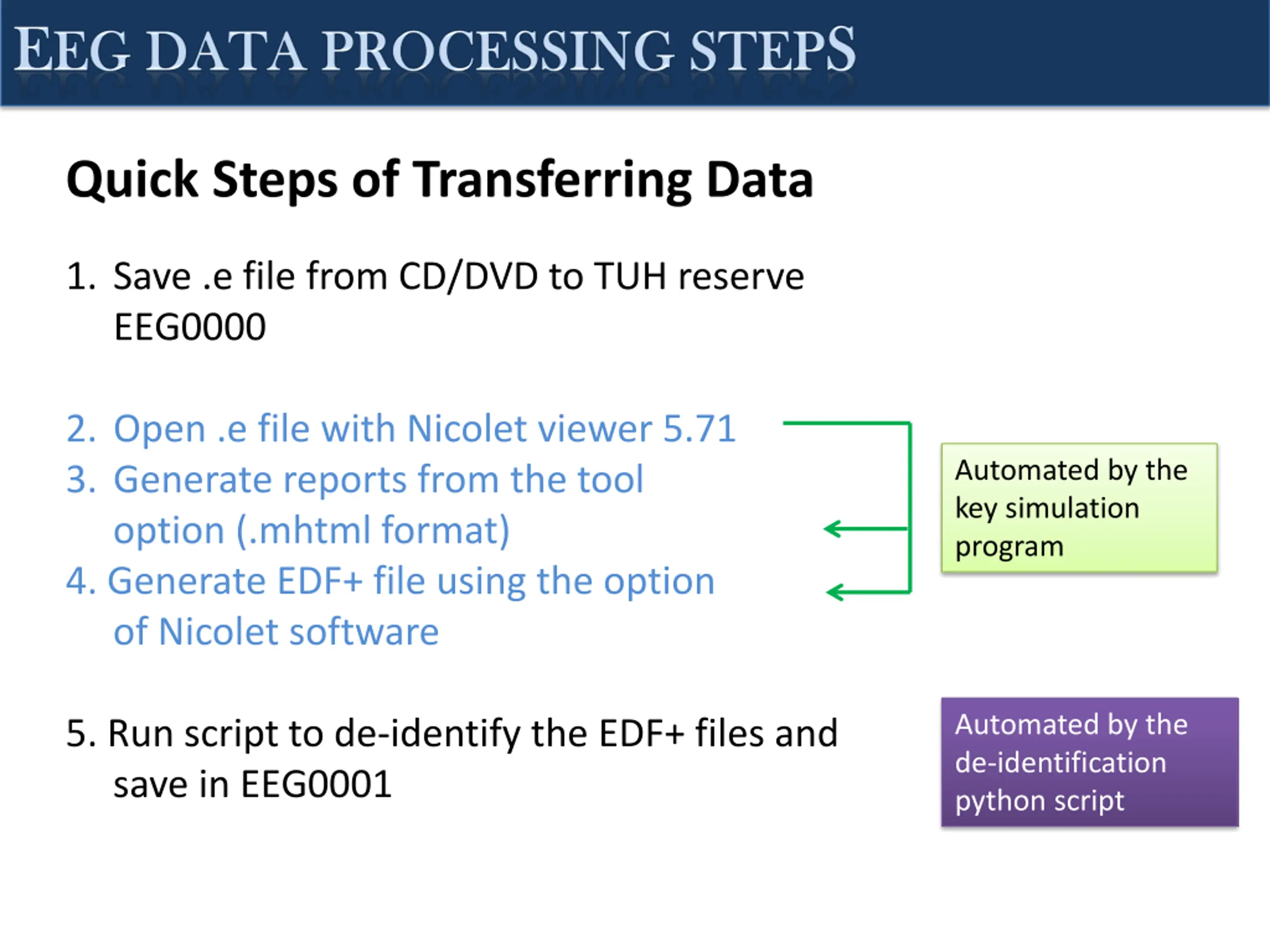 Quick Steps of Transferring Data 1. Save .e file from CD/DVD to TUH reserve EEG0000 2. Open .e file with Nicolet viewer 5.71 3. Generate reports from the tool option (.mhtml format) 4. Generate EDF+ file using the option of Nicolet software Automated by the key simulation program Automated by the de-identification python script 5. Run script to de-identify the EDF+ files and save in EEG0001