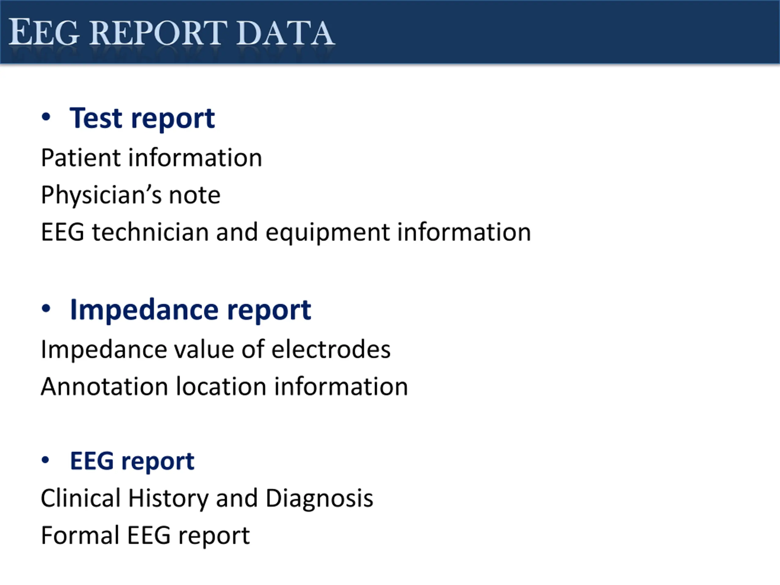 Test report Patient information Physician s note EEG technician and equipment information Impedance report Impedance value of electrodes Annotation location information EEG report Clinical History and Diagnosis Formal EEG report