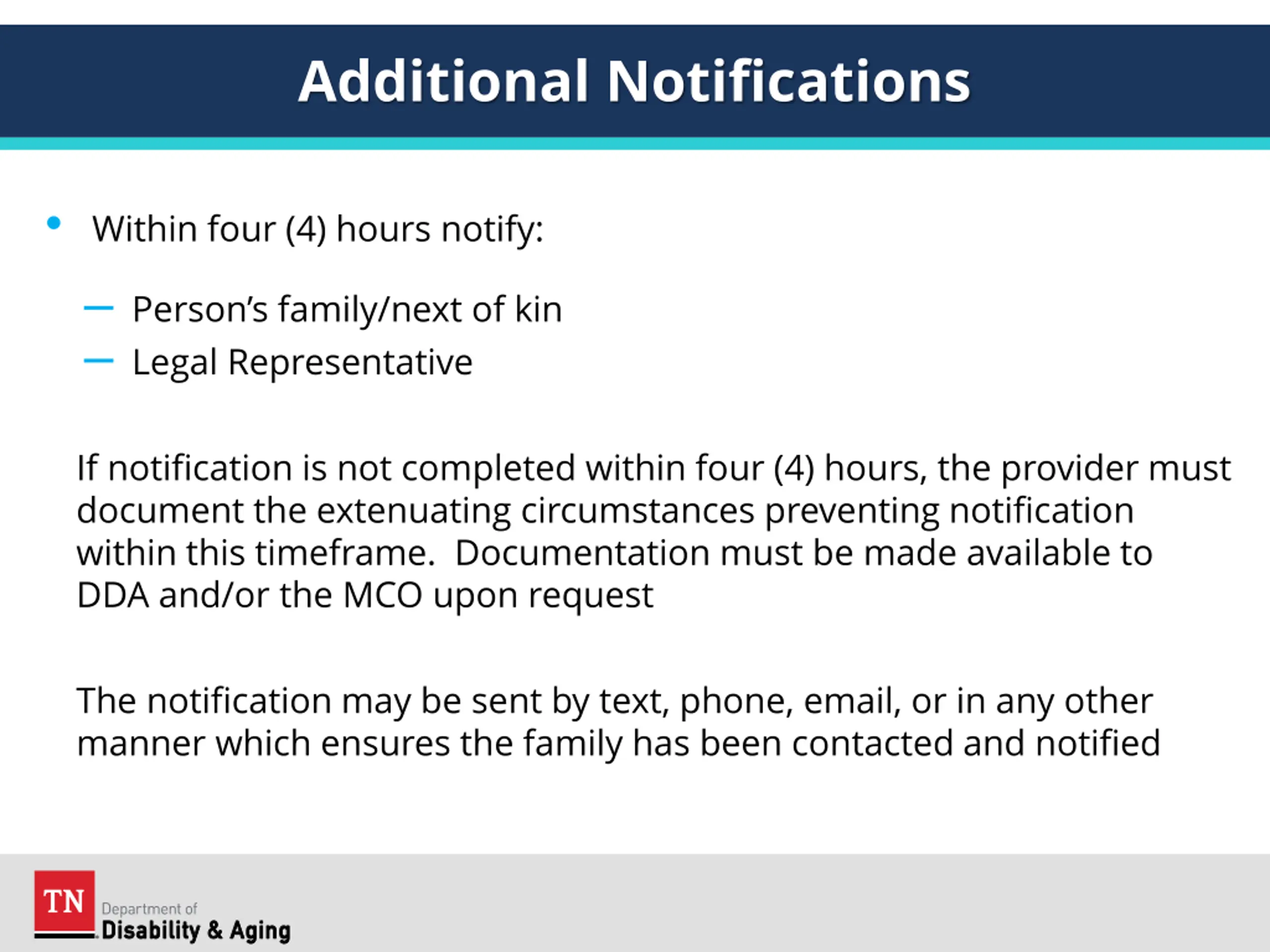 Additional Notifications Within four (4) hours notify: Person s family/next of kin Legal Representative If notification is not completed within four (4) hours, the provider must document the extenuating circumstances preventing notification within this timeframe. Documentation must be made available to DDA and/or the MCO upon request The notification may be sent by text, phone, email, or in any other manner which ensures the family has been contacted and notified
