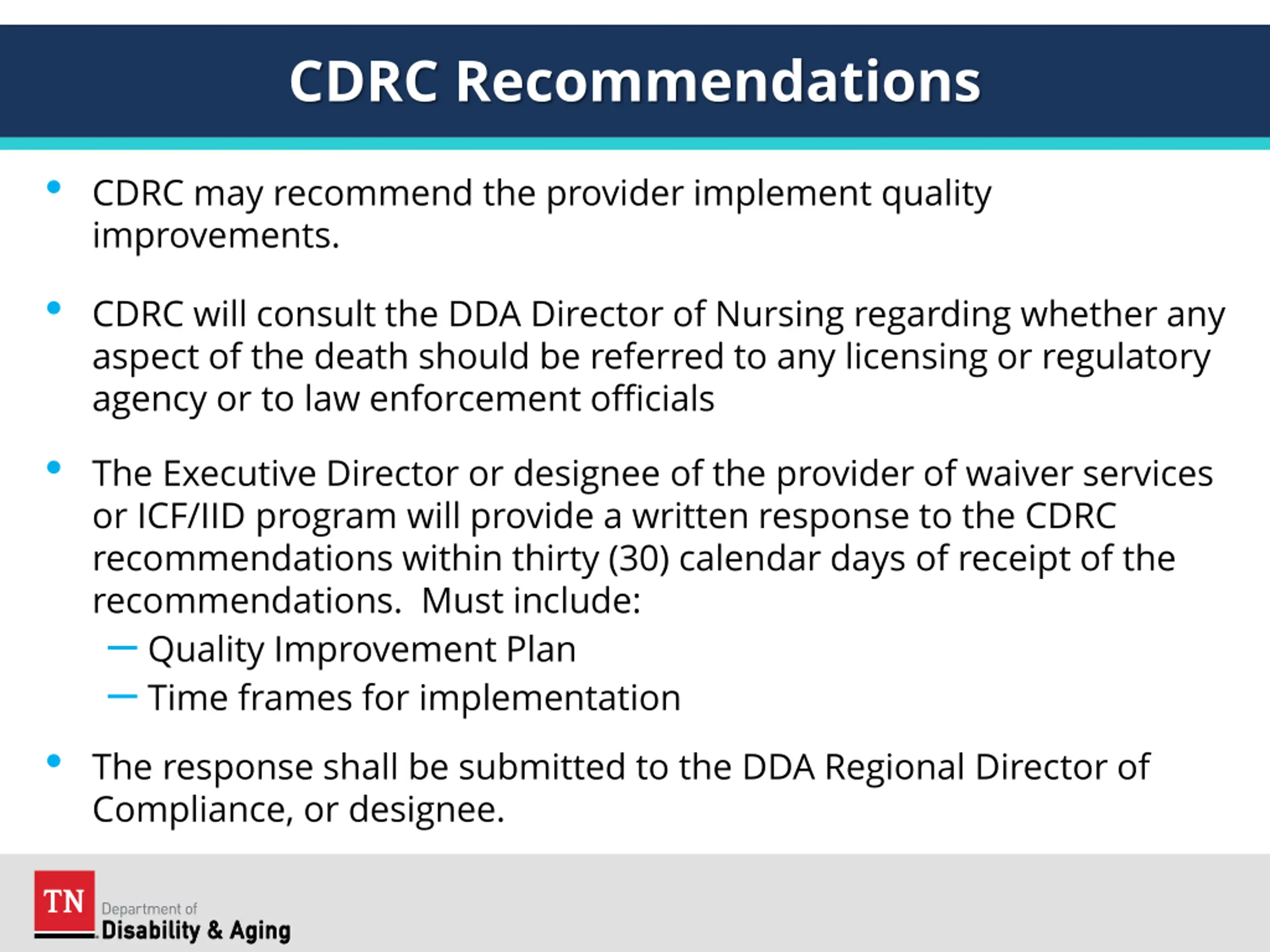 CDRC Recommendations CDRC may recommend the provider implement quality improvements. CDRC will consult the DDA Director of Nursing regarding whether any aspect of the death should be referred to any licensing or regulatory agency or to law enforcement officials The Executive Director or designee of the provider of waiver services or ICF/IID program will provide a written response to the CDRC recommendations within thirty (30) calendar days of receipt of the recommendations. Must include: Quality Improvement Plan Time frames for implementation The response shall be submitted to the DDA Regional Director of Compliance, or designee.