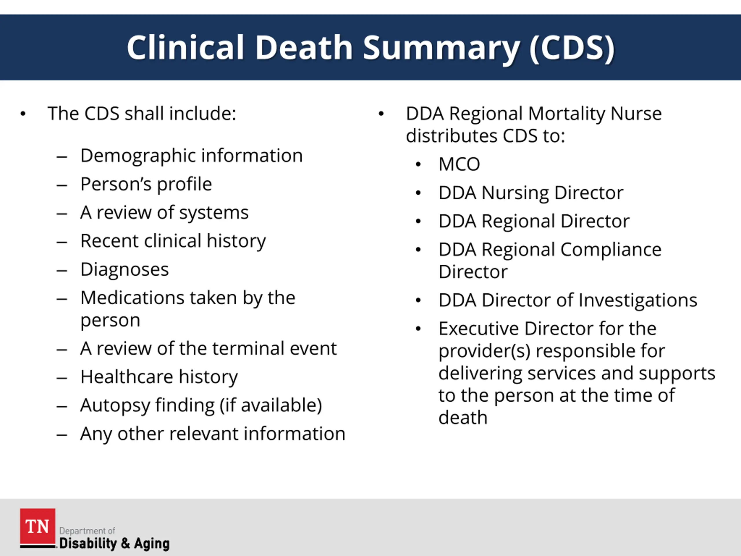 Clinical Death Summary (CDS) The CDS shall include: DDA Regional Mortality Nurse distributes CDS to: MCO DDA Nursing Director DDA Regional Director DDA Regional Compliance Director DDA Director of Investigations Executive Director for the provider(s) responsible for delivering services and supports to the person at the time of death Demographic information Person s profile A review of systems Recent clinical history Diagnoses Medications taken by the person A review of the terminal event Healthcare history Autopsy finding (if available) Any other relevant information