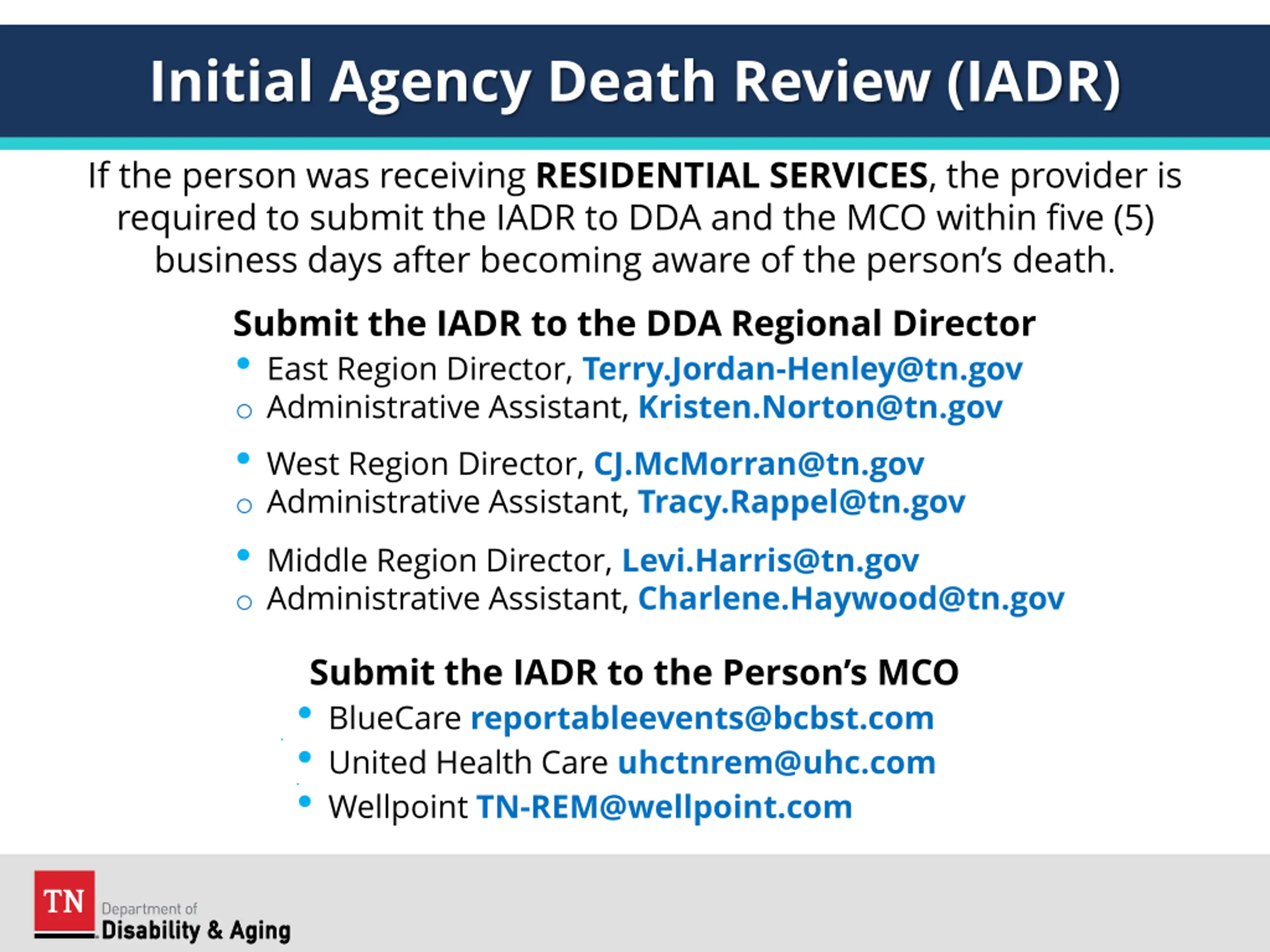 Initial Agency Death Review (IADR) If the person was receiving RESIDENTIAL SERVICES, the provider is required to submit the IADR to DDA and the MCO within five (5) business days after becoming aware of the person s death. Submit the IADR to the DDA Regional Director East Region Director, Terry.Jordan-Henley@tn.gov o Administrative Assistant, Kristen.Norton@tn.gov West Region Director, CJ.McMorran@tn.gov o Administrative Assistant, Tracy.Rappel@tn.gov Middle Region Director, Levi.Harris@tn.gov o Administrative Assistant, Charlene.Haywood@tn.gov Submit the IADR to the Person s MCO BlueCare reportableevents@bcbst.com United Health Care uhctnrem@uhc.com Wellpoint TN-REM@wellpoint.com