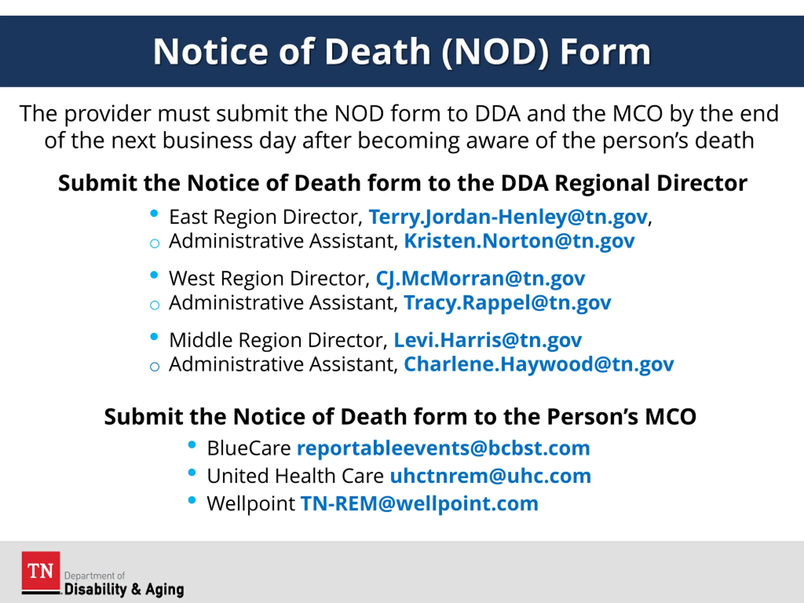 Notice of Death (NOD) Form The provider must submit the NOD form to DDA and the MCO by the end of the next business day after becoming aware of the person s death Submit the Notice of Death form to the DDA Regional Director East Region Director, Terry.Jordan-Henley@tn.gov, o Administrative Assistant, Kristen.Norton@tn.gov West Region Director, CJ.McMorran@tn.gov o Administrative Assistant, Tracy.Rappel@tn.gov Middle Region Director, Levi.Harris@tn.gov o Administrative Assistant, Charlene.Haywood@tn.gov Submit the Notice of Death form to the Person s MCO BlueCare reportableevents@bcbst.com United Health Care uhctnrem@uhc.com Wellpoint TN-REM@wellpoint.com