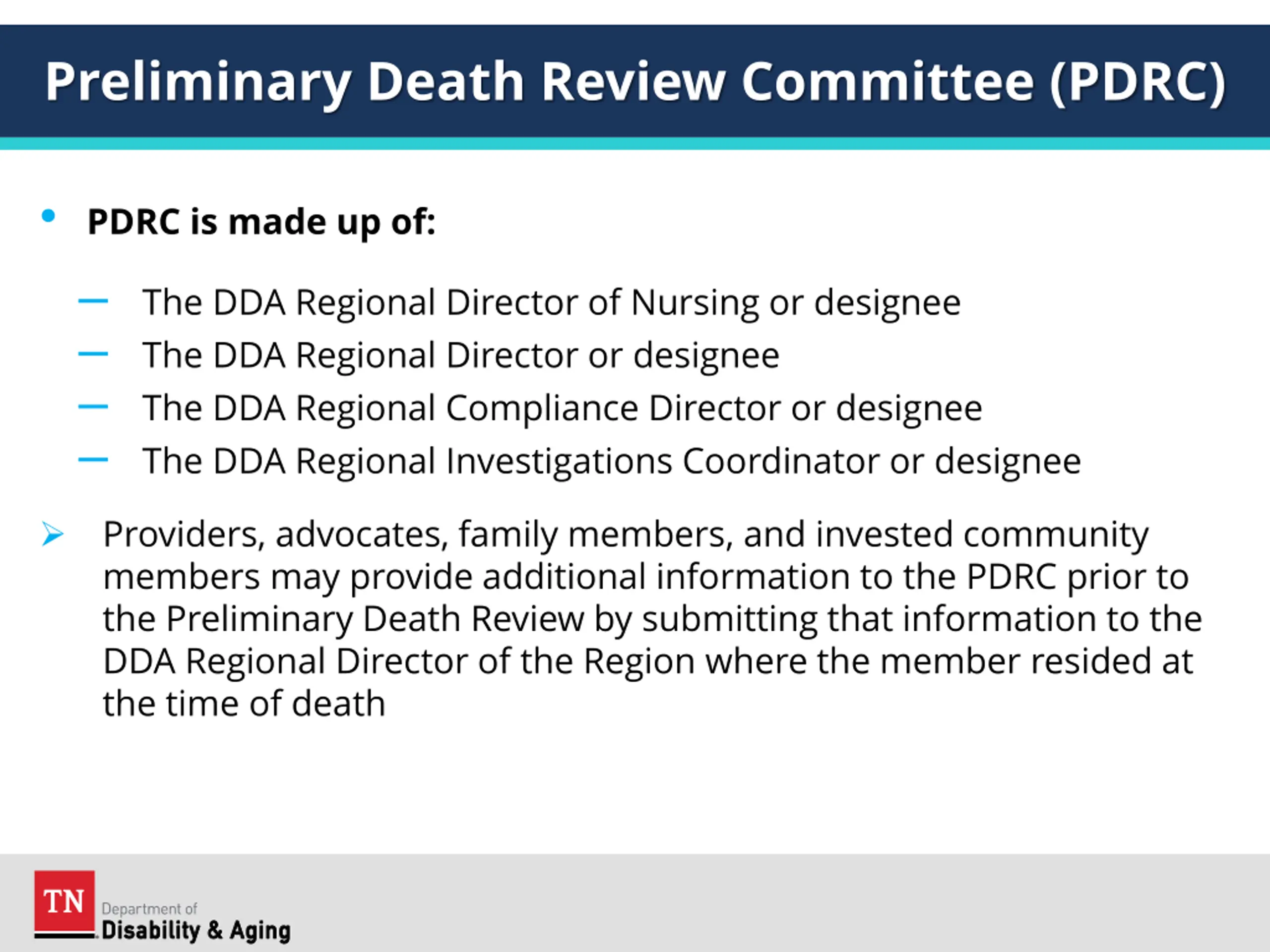 Preliminary Death Review Committee (PDRC) PDRC is made up of: The DDA Regional Director of Nursing or designee The DDA Regional Director or designee The DDA Regional Compliance Director or designee The DDA Regional Investigations Coordinator or designee Providers, advocates, family members, and invested community members may provide additional information to the PDRC prior to the Preliminary Death Review by submitting that information to the DDA Regional Director of the Region where the member resided at the time of death