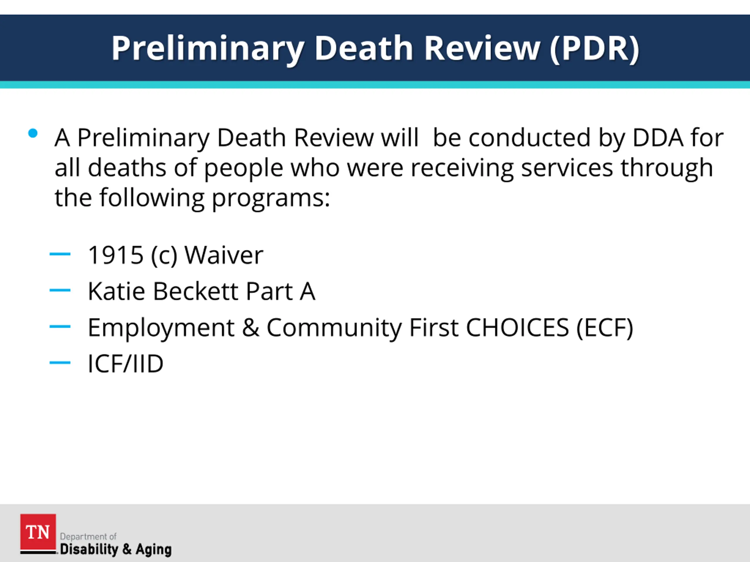 Preliminary Death Review (PDR) A Preliminary Death Review will be conducted by DDA for all deaths of people who were receiving services through the following programs: 1915 (c) Waiver Katie Beckett Part A Employment & Community First CHOICES (ECF) ICF/IID