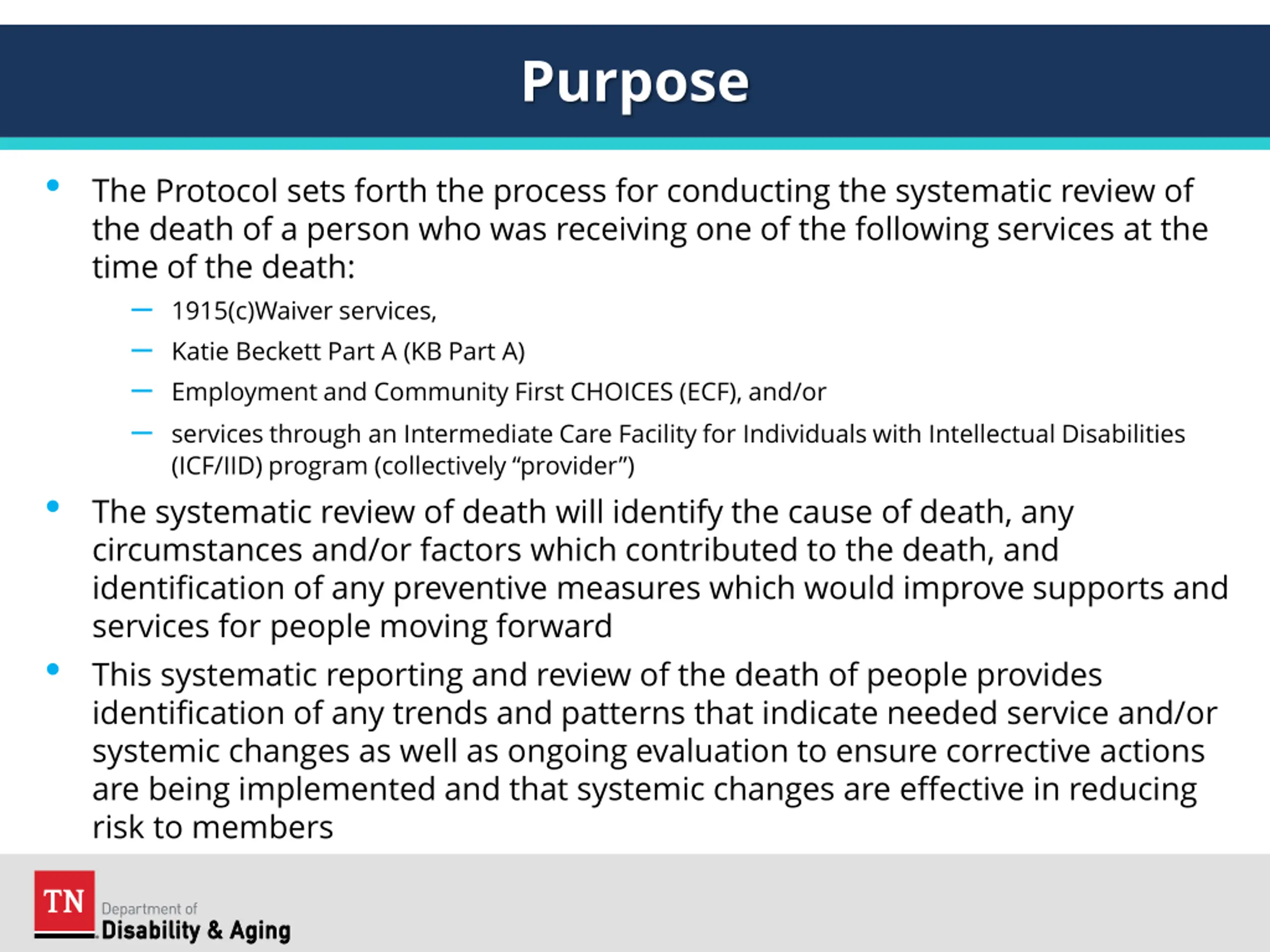 Purpose The Protocol sets forth the process for conducting the systematic review of the death of a person who was receiving one of the following services at the time of the death: 1915(c)Waiver services, Katie Beckett Part A (KB Part A) Employment and Community First CHOICES (ECF), and/or services through an Intermediate Care Facility for Individuals with Intellectual Disabilities (ICF/IID) program (collectively provider ) The systematic review of death will identify the cause of death, any circumstances and/or factors which contributed to the death, and identification of any preventive measures which would improve supports and services for people moving forward This systematic reporting and review of the death of people provides identification of any trends and patterns that indicate needed service and/or systemic changes as well as ongoing evaluation to ensure corrective actions are being implemented and that systemic changes are effective in reducing risk to members