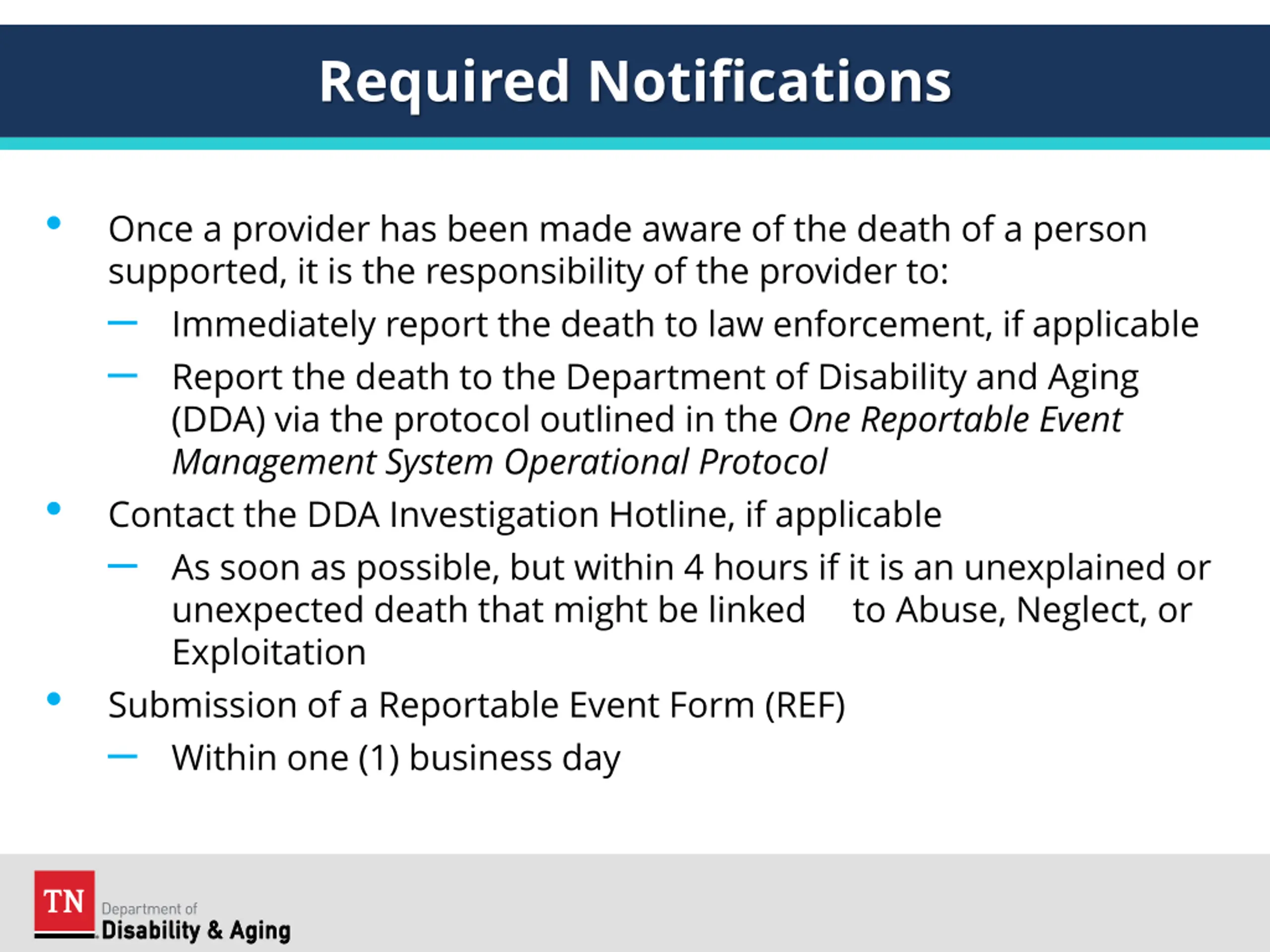 Required Notifications Once a provider has been made aware of the death of a person supported, it is the responsibility of the provider to: Immediately report the death to law enforcement, if applicable Report the death to the Department of Disability and Aging (DDA) via the protocol outlined in the One Reportable Event Management System Operational Protocol Contact the DDA Investigation Hotline, if applicable As soon as possible, but within 4 hours if it is an unexplained or unexpected death that might be linked to Abuse, Neglect, or Exploitation Submission of a Reportable Event Form (REF) Within one (1) business day