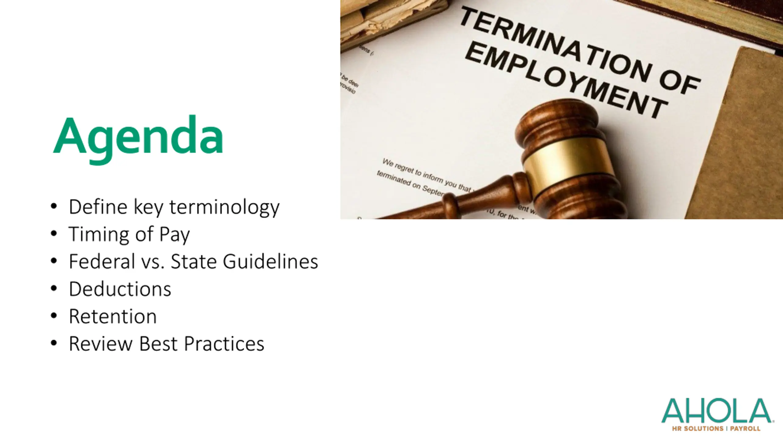 Agenda Define key terminology Timing of Pay Federal vs. State Guidelines Deductions Retention Review Best Practices