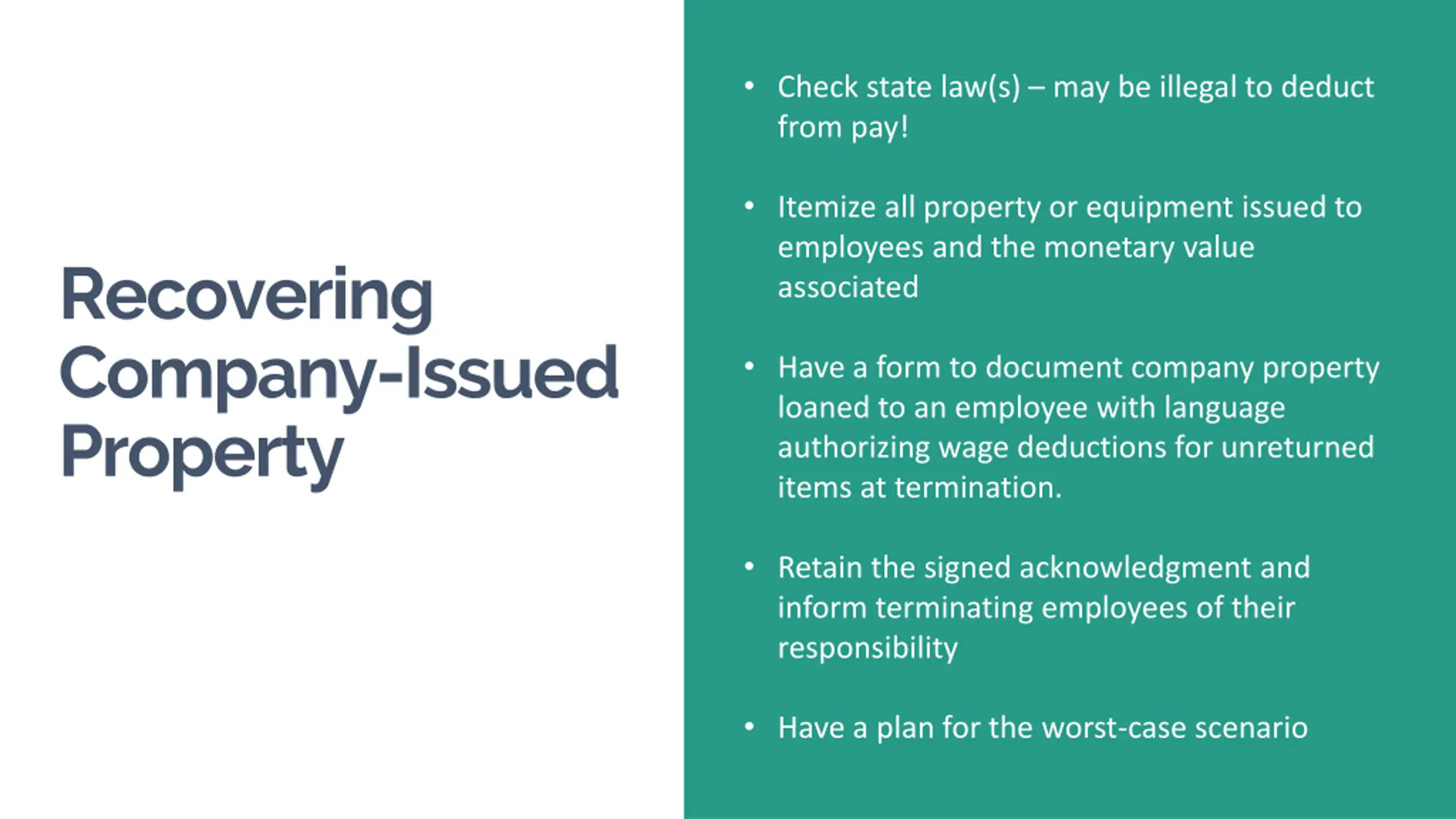 Check state law(s) may be illegal to deduct from pay! Itemize all property or equipment issued to employees and the monetary value associated Recovering Company-Issued Property Have a form to document company property loaned to an employee with language authorizing wage deductions for unreturned items at termination. Retain the signed acknowledgment and inform terminating employees of their responsibility Have a plan for the worst-case scenario