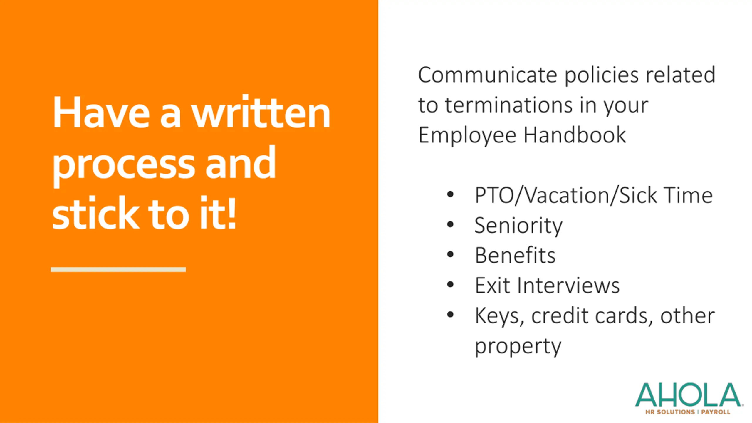 Communicate policies related to terminations in your Employee Handbook Have a written process and stick to it! PTO/Vacation/Sick Time Seniority Benefits Exit Interviews Keys, credit cards, other property