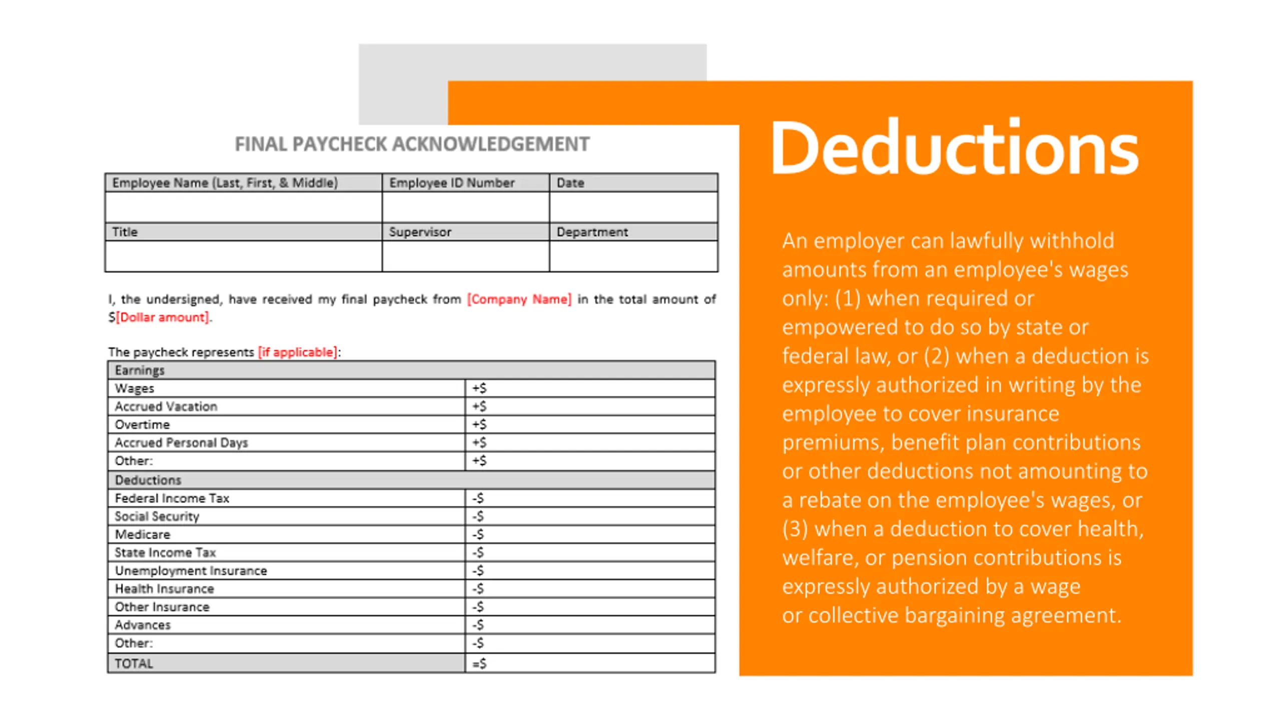 Deductions An employer can lawfully withhold amounts from an employee's wages only: (1) when required or empowered to do so by state or federal law, or (2) when a deduction is expressly authorized in writing by the employee to cover insurance premiums, benefit plan contributions or other deductions not amounting to a rebate on the employee's wages, or (3) when a deduction to cover health, welfare, or pension contributions is expressly authorized by a wage or collective bargaining agreement.