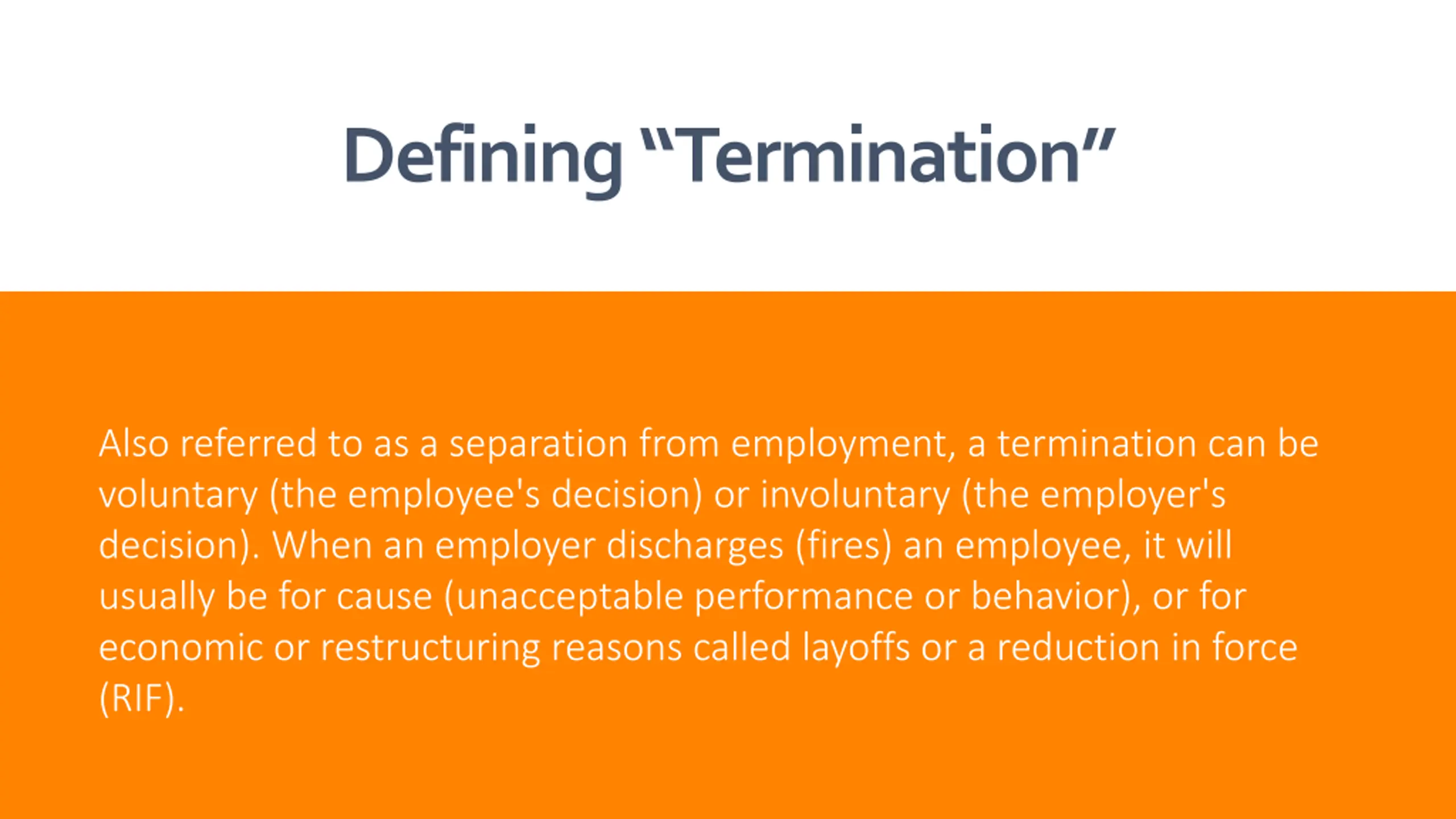 Defining Termination Also referred to as a separation from employment, a termination can be voluntary (the employee's decision) or involuntary (the employer's decision). When an employer discharges (fires) an employee, it will usually be for cause (unacceptable performance or behavior), or for economic or restructuring reasons called layoffs or a reduction in force (RIF).