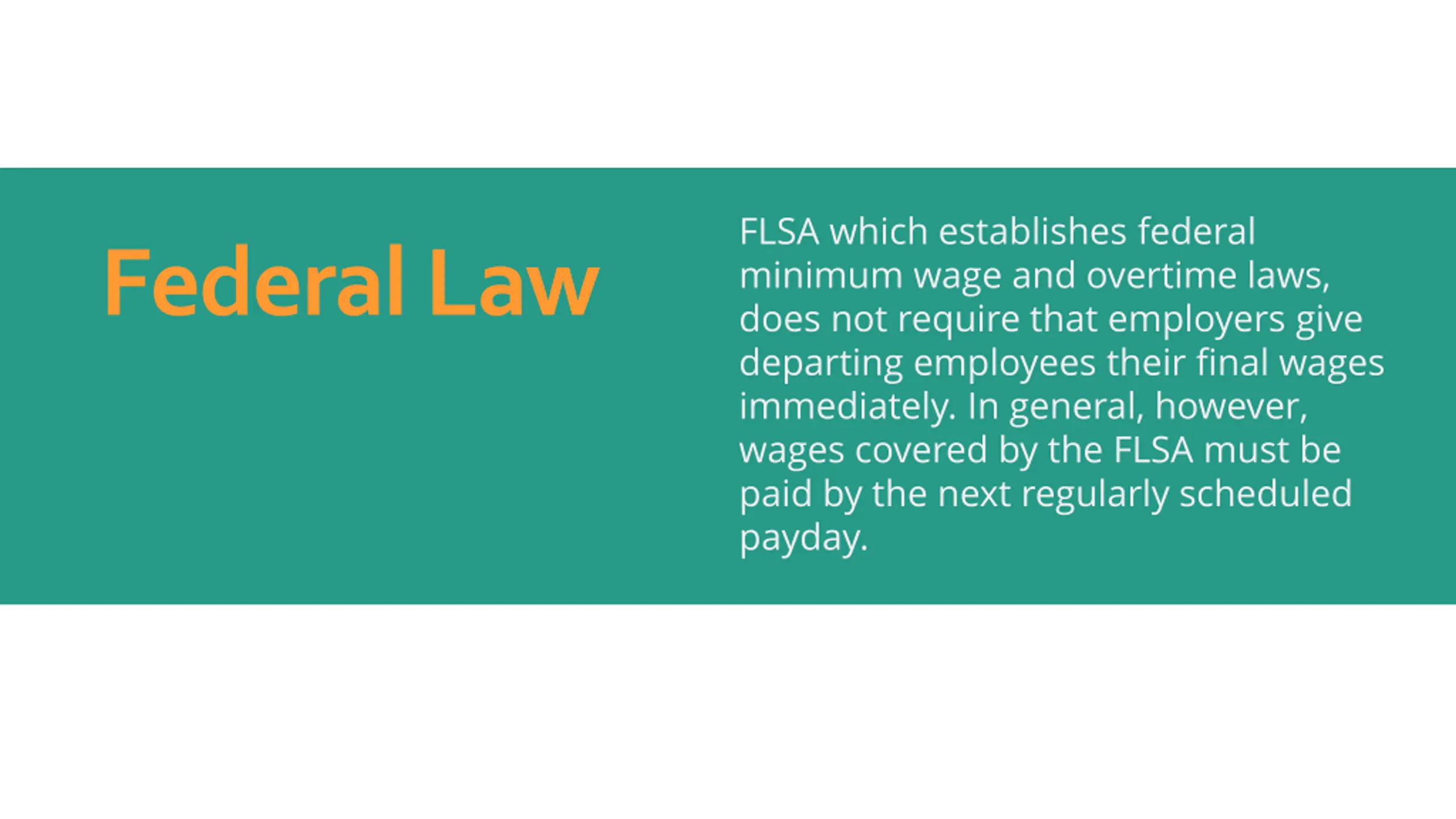 FLSA which establishes federal minimum wage and overtime laws, does not require that employers give departing employees their final wages immediately. In general, however, wages covered by the FLSA must be paid by the next regularly scheduled payday. Federal Law