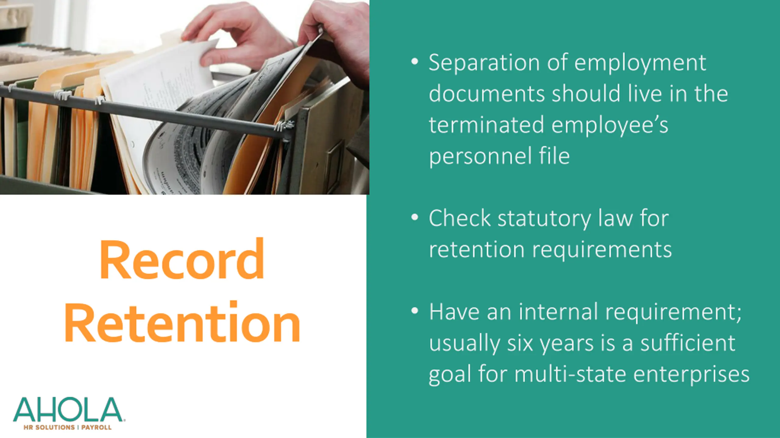 Separation of employment documents should live in the terminated employee s personnel file Check statutory law for retention requirements Record Retention Have an internal requirement; usually six years is a sufficient goal for multi-state enterprises