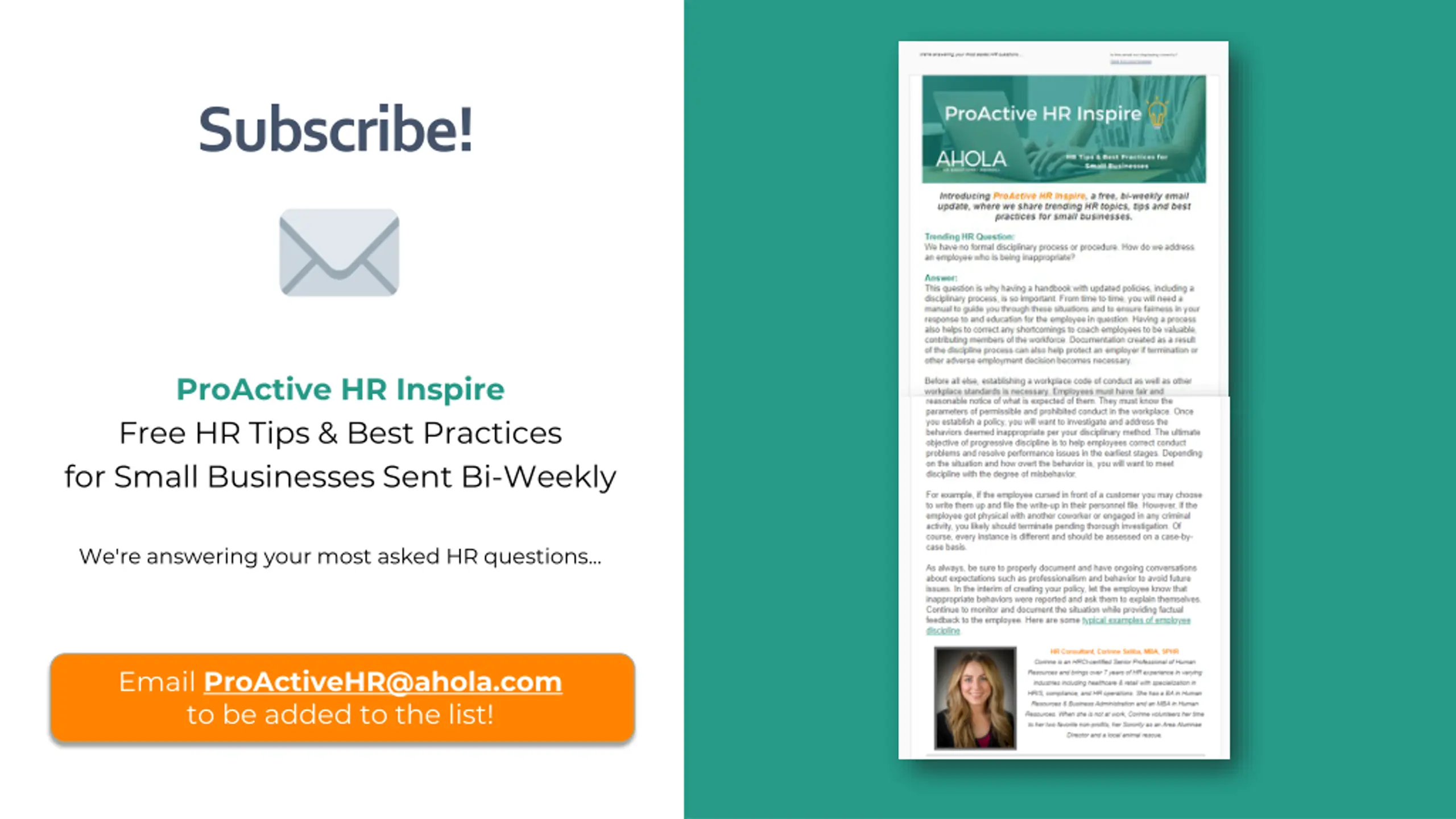 Subscribe! ProActive HR Inspire Free HR Tips & Best Practices for Small Businesses Sent Bi-Weekly We're answering your most asked HR questions... Email ProActiveHR@ahola.com to be added to the list!