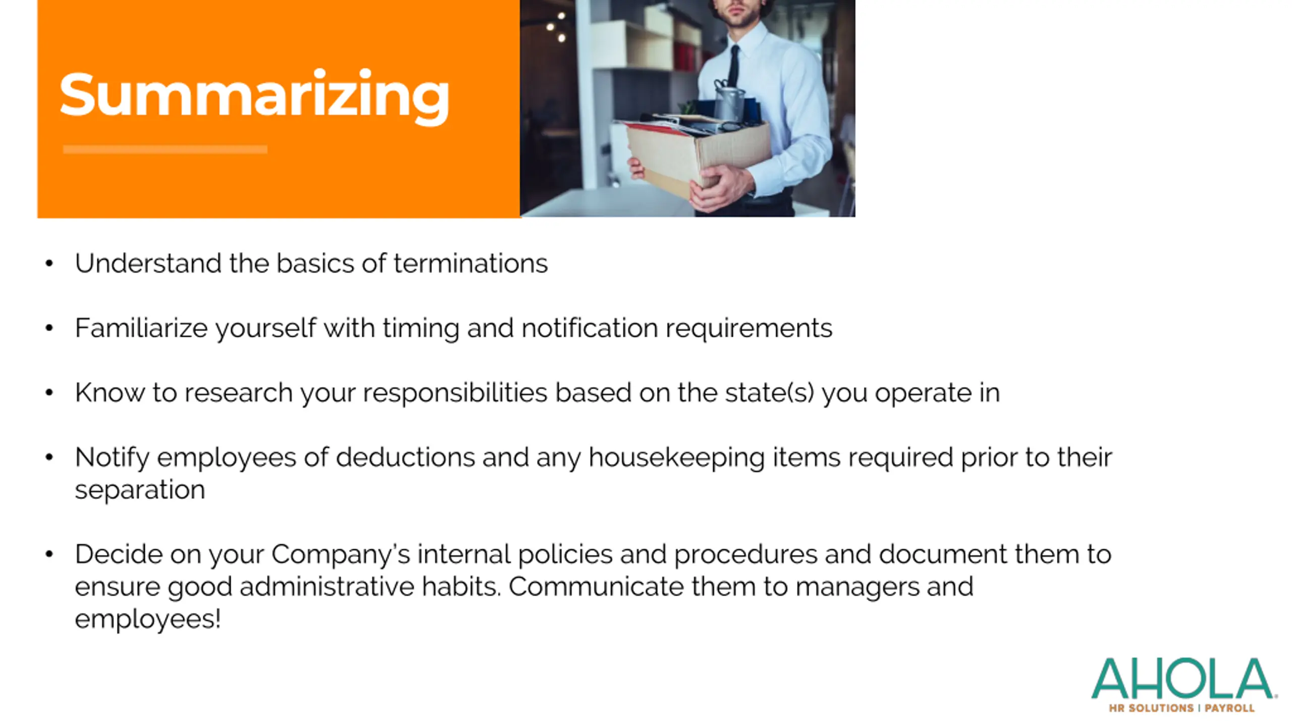 Summarizing Understand the basics of terminations Familiarize yourself with timing and notification requirements Know to research your responsibilities based on the state(s) you operate in Notify employees of deductions and any housekeeping items required prior to their separation Decide on your Company s internal policies and procedures and document them to ensure good administrative habits. Communicate them to managers and employees!