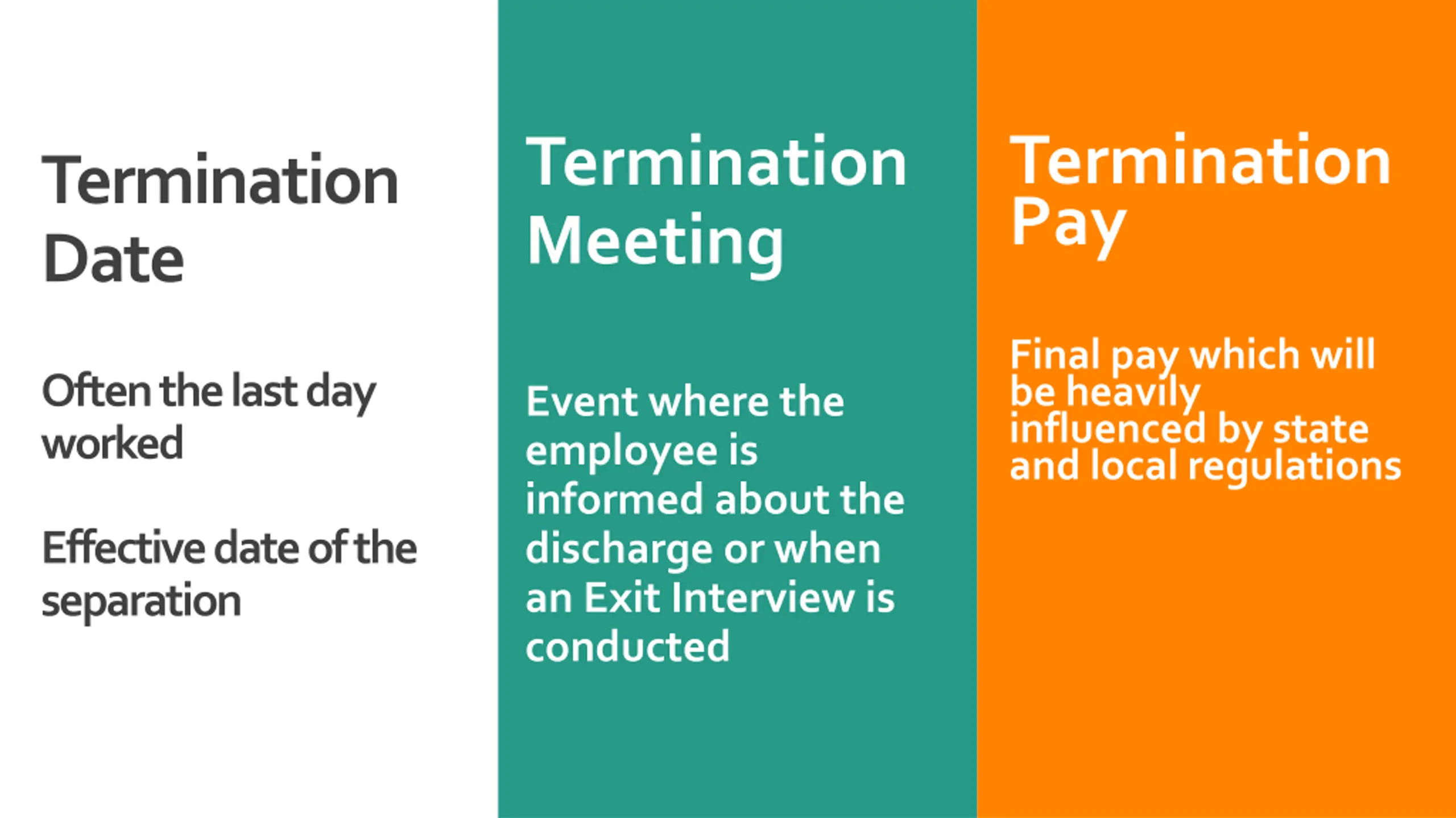 Termination Pay Termination Meeting Termination Date Final pay which will be heavily influenced by state and local regulations Often the last day worked Event where the employee is informed about the discharge or when an Exit Interview is conducted Effective date of the separation