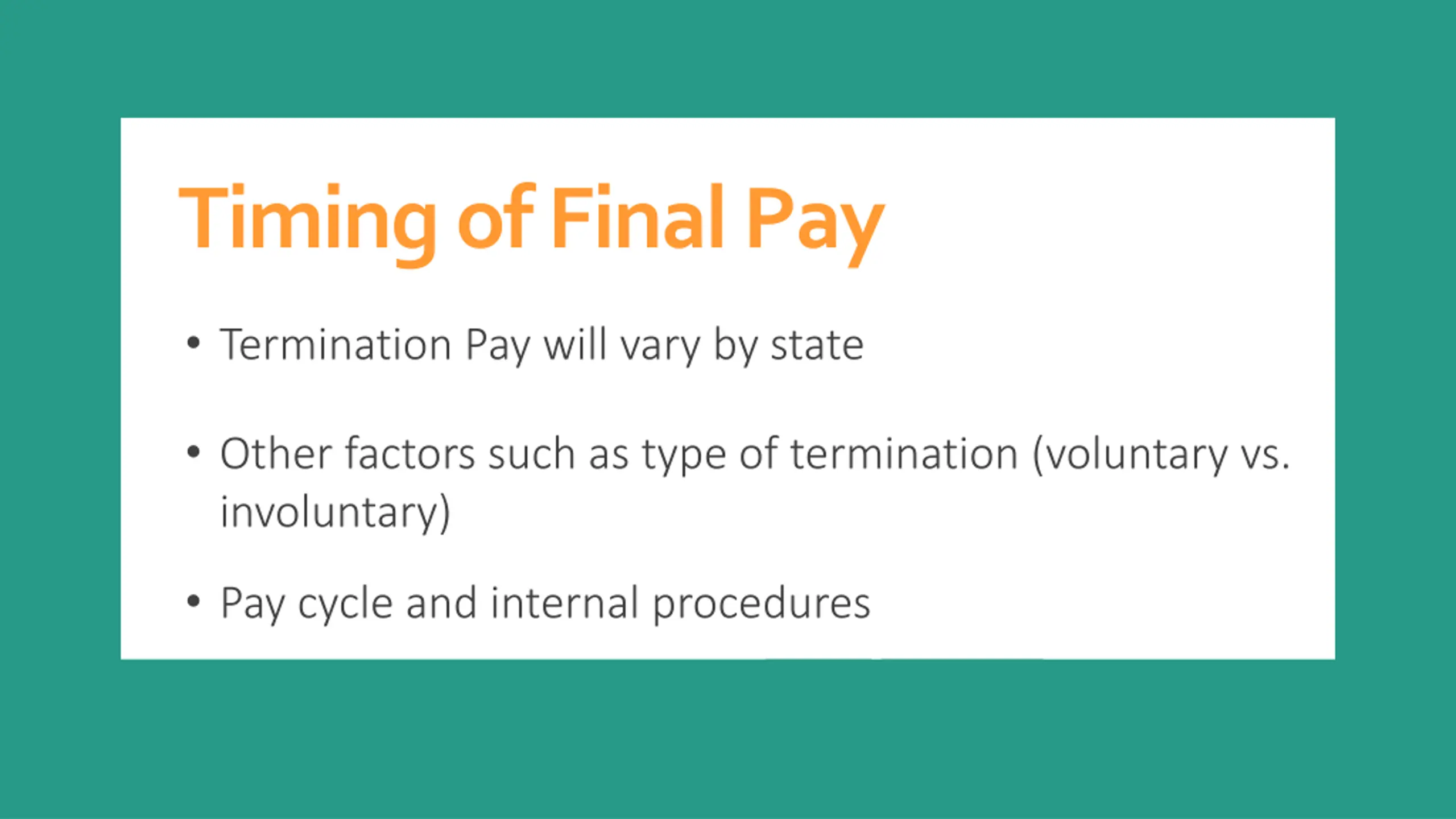 Timing of Final Pay Termination Pay will vary by state Other factors such as type of termination (voluntary vs. involuntary) Pay cycle and internal procedures