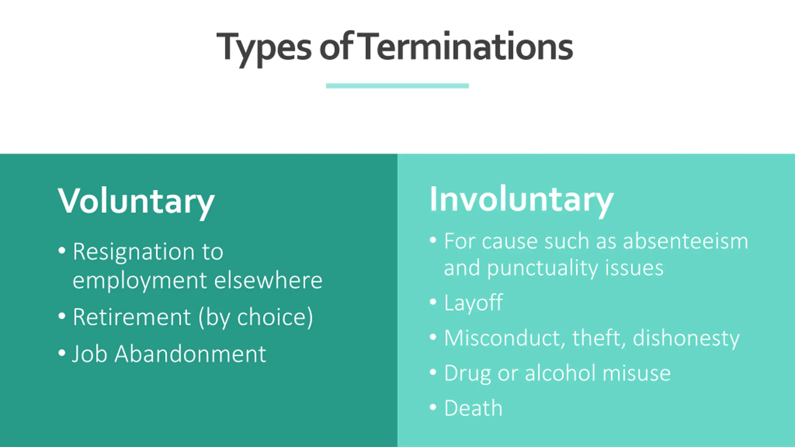 Types of Terminations Involuntary For cause such as absenteeism and punctuality issues Layoff Misconduct, theft, dishonesty Drug or alcohol misuse Death Voluntary Resignation to employment elsewhere Retirement (by choice) Job Abandonment