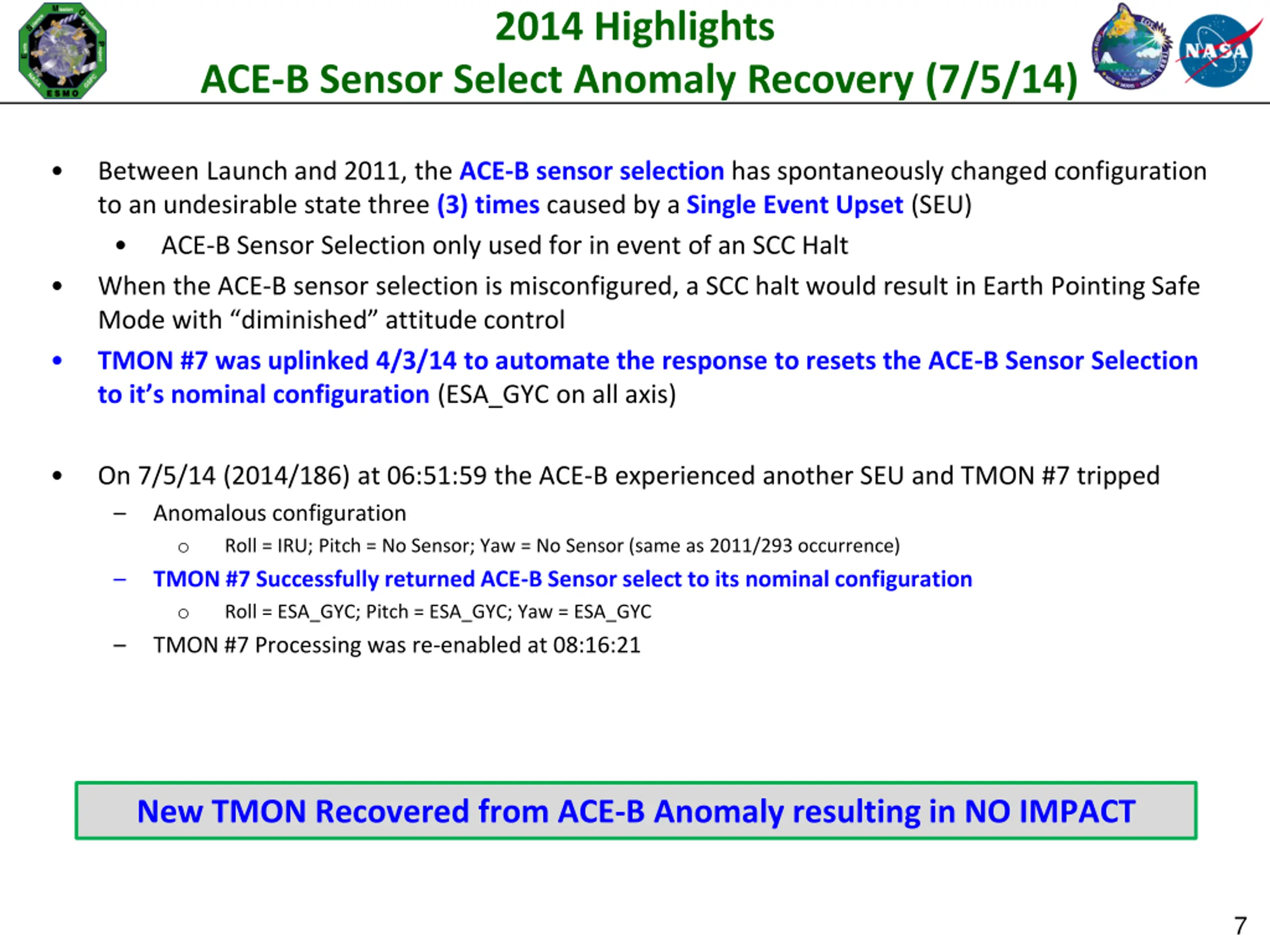 2014 Highlights ACE-B Sensor Select Anomaly Recovery (7/5/14) Between Launch and 2011, the ACE-B sensor selection has spontaneously changed configuration to an undesirable state three (3) times caused by a Single Event Upset (SEU) ACE-B Sensor Selection only used for in event of an SCC Halt When the ACE-B sensor selection is misconfigured, a SCC halt would result in Earth Pointing Safe Mode with diminished attitude control TMON #7 was uplinked 4/3/14 to automate the response to resets the ACE-B Sensor Selection to it s nominal configuration (ESA_GYC on all axis) On 7/5/14 (2014/186) at 06:51:59 the ACE-B experienced another SEU and TMON #7 tripped Anomalous configuration o Roll = IRU; Pitch = No Sensor; Yaw = No Sensor (same as 2011/293 occurrence) TMON #7 Successfully returned ACE-B Sensor select to its nominal configuration o Roll = ESA_GYC; Pitch = ESA_GYC; Yaw = ESA_GYC TMON #7 Processing was re-enabled at 08:16:21 New TMON Recovered from ACE-B Anomaly resulting in NO IMPACT 7