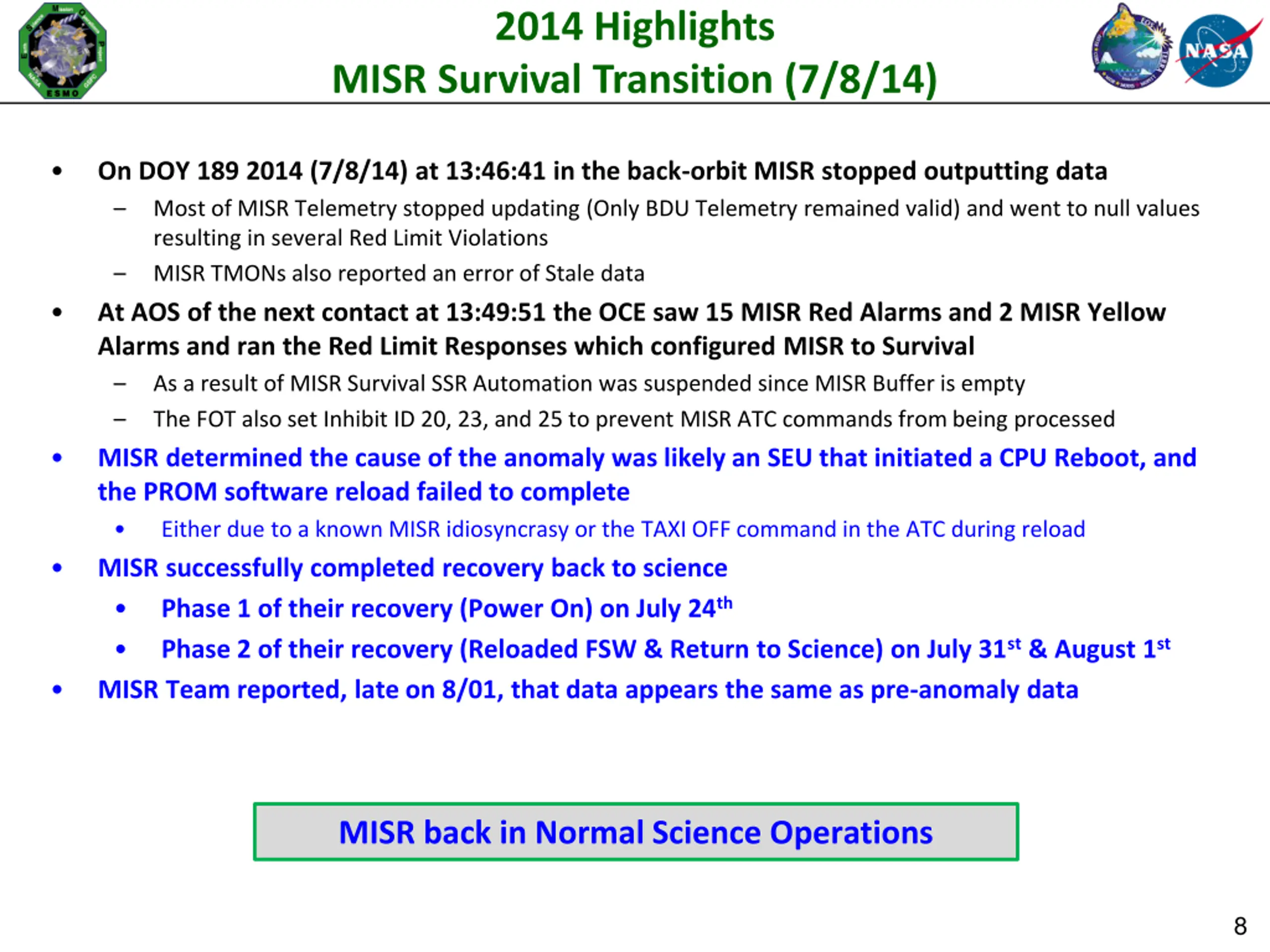 2014 Highlights MISR Survival Transition (7/8/14) On DOY 189 2014 (7/8/14) at 13:46:41 in the back-orbit MISR stopped outputting data Most of MISR Telemetry stopped updating (Only BDU Telemetry remained valid) and went to null values resulting in several Red Limit Violations MISR TMONs also reported an error of Stale data At AOS of the next contact at 13:49:51 the OCE saw 15 MISR Red Alarms and 2 MISR Yellow Alarms and ran the Red Limit Responses which configured MISR to Survival As a result of MISR Survival SSR Automation was suspended since MISR Buffer is empty The FOT also set Inhibit ID 20, 23, and 25 to prevent MISR ATC commands from being processed MISR determined the cause of the anomaly was likely an SEU that initiated a CPU Reboot, and the PROM software reload failed to complete Either due to a known MISR idiosyncrasy or the TAXI OFF command in the ATC during reload MISR successfully completed recovery back to science Phase 1 of their recovery (Power On) on July 24th Phase 2 of their recovery (Reloaded FSW & Return to Science) on July 31st & August 1st MISR Team reported, late on 8/01, that data appears the same as pre-anomaly data MISR back in Normal Science Operations 8