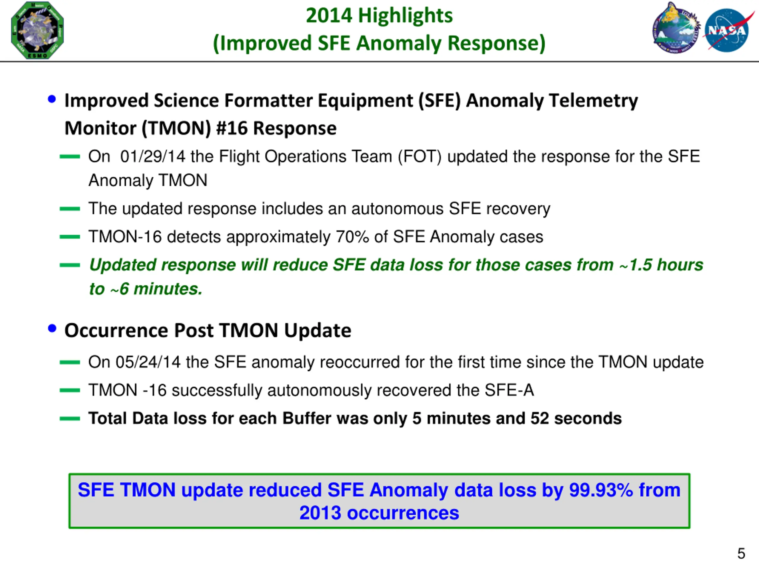 2014 Highlights (Improved SFE Anomaly Response) Improved Science Formatter Equipment (SFE) Anomaly Telemetry Monitor (TMON) #16 Response On 01/29/14 the Flight Operations Team (FOT) updated the response for the SFE Anomaly TMON The updated response includes an autonomous SFE recovery TMON-16 detects approximately 70% of SFE Anomaly cases Updated response will reduce SFE data loss for those cases from ~1.5 hours to ~6 minutes. Occurrence Post TMON Update On 05/24/14 the SFE anomaly reoccurred for the first time since the TMON update TMON -16 successfully autonomously recovered the SFE-A Total Data loss for each Buffer was only 5 minutes and 52 seconds SFE TMON update reduced SFE Anomaly data loss by 99.93% from 2013 occurrences 5