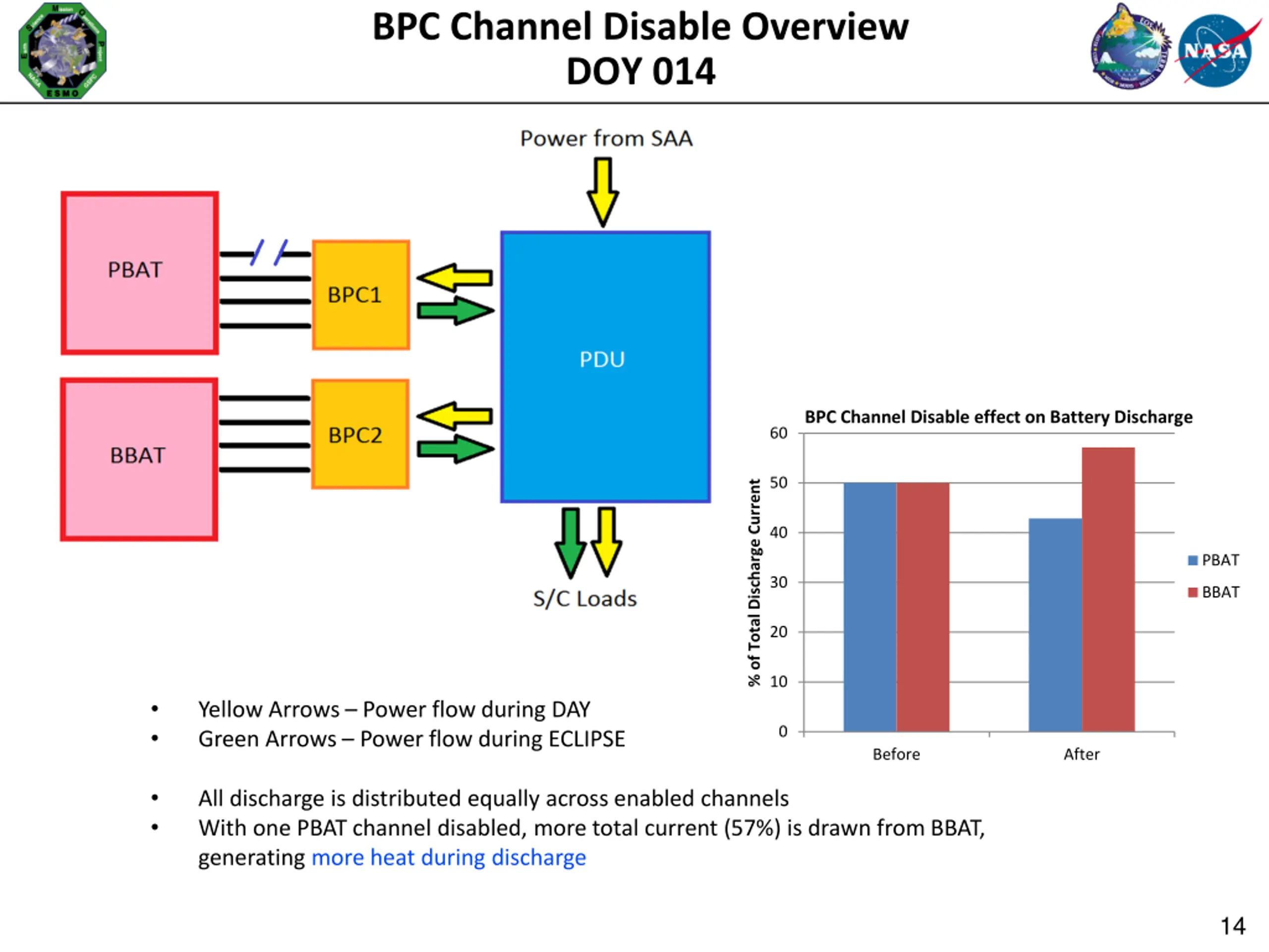 BPC Channel Disable Overview Background / Purpose Following the 2009 BBAT Anomaly, Battery Cell temperatures dropped and became much colder than normal. The FOT has stabilized temperatures since anomaly The FOT is constantly looking for ways to improve temperatures. This will improve our ability to respond to future anomalies, and prolong battery life and mission life to be able to support science The purpose of this activity was to generate more heat in BBAT by shifting load and causing more discharge from BBAT. With 1 BPC1 (PBAT) channel disabled, BBAT will now take ~57% (4/7ths) of the discharge load This test was one of many options that the FOT is pursuing in an effort to increase battery temperatures, improve future anomaly response, and prolong mission life. 13
