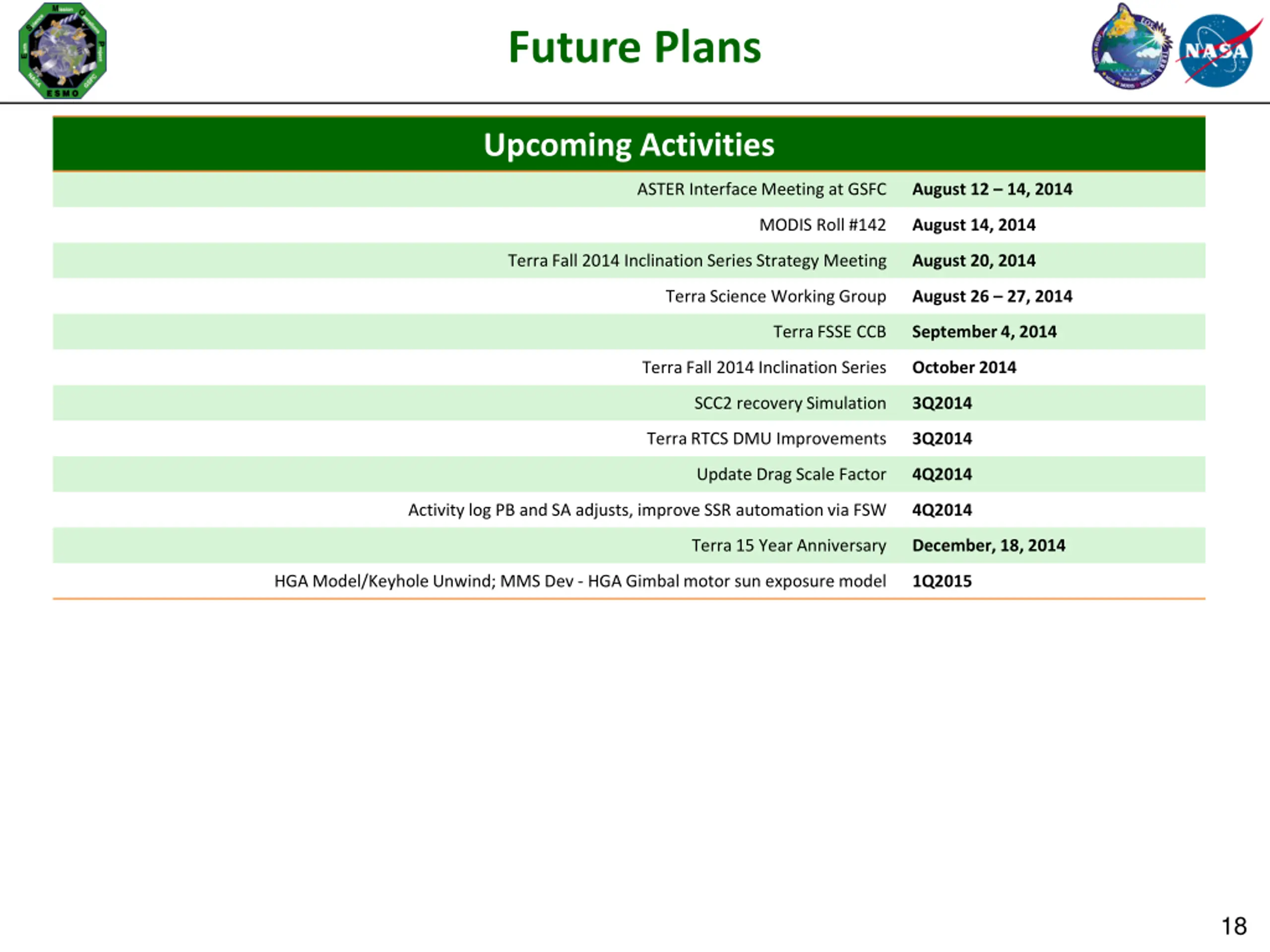 Future Plans Upcoming Activities ASTER Interface Meeting at GSFC August 12 14, 2014 MODIS Roll #142 August 14, 2014 Terra Fall 2014 Inclination Series Strategy Meeting August 20, 2014 Terra Science Working Group August 26 27, 2014 Terra FSSE CCB September 4, 2014 Terra Fall 2014 Inclination Series October 2014 SCC2 recovery Simulation 3Q2014 Terra RTCS DMU Improvements 3Q2014 Update Drag Scale Factor 4Q2014 Activity log PB and SA adjusts, improve SSR automation via FSW 4Q2014 Terra 15 Year Anniversary December, 18, 2014 HGA Model/Keyhole Unwind; MMS Dev - HGA Gimbal motor sun exposure model 1Q2015 18