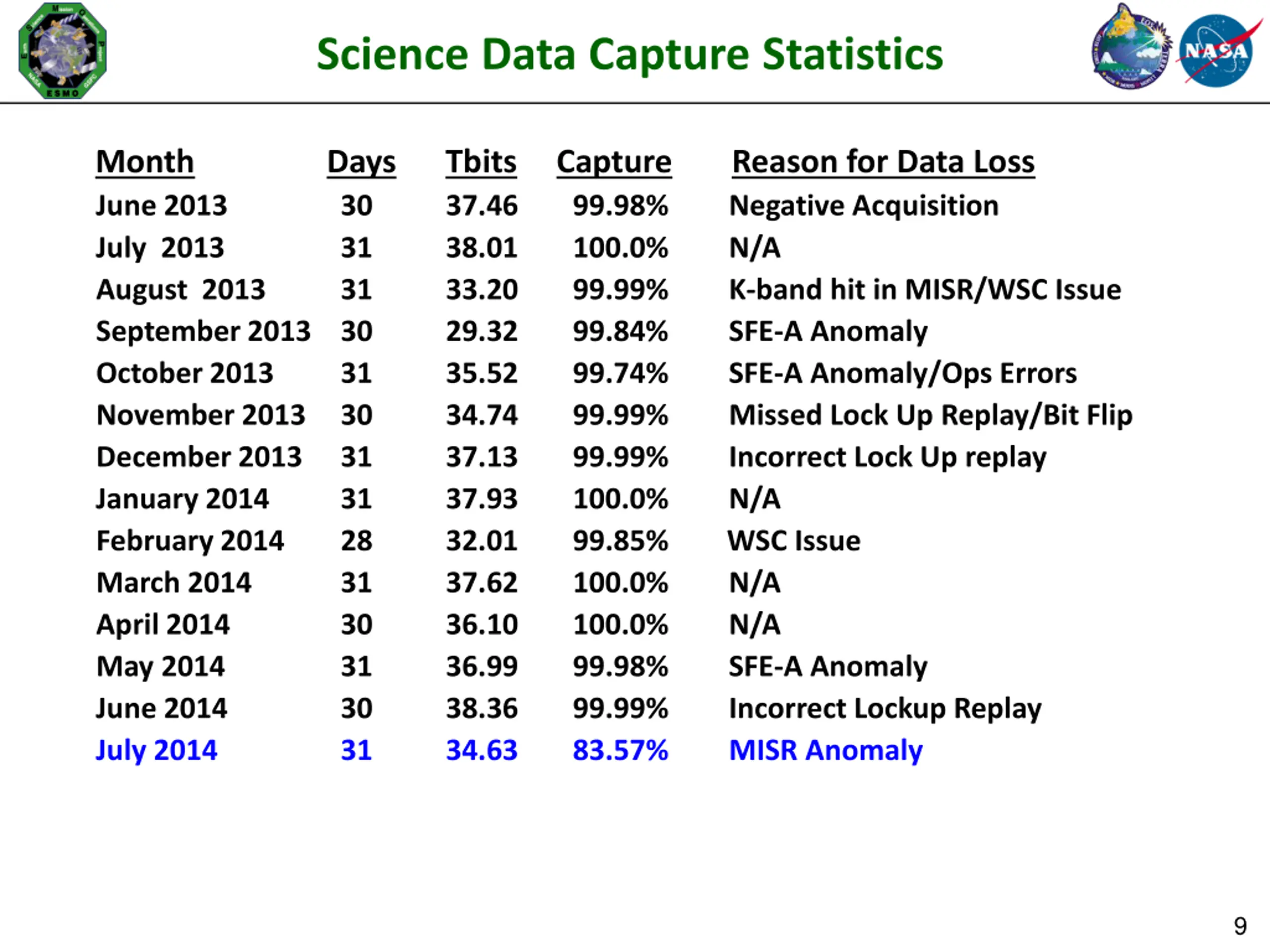Science Data Capture Statistics Month June 2013 July 2013 August 2013 September 2013 30 October 2013 November 2013 30 December 2013 31 January 2014 February 2014 28 March 2014 April 2014 May 2014 June 2014 July 2014 Days 30 31 31 Tbits Capture 37.46 38.01 33.20 29.32 35.52 34.74 37.13 37.93 32.01 37.62 36.10 36.99 38.36 34.63 Reason for Data Loss 99.98% Negative Acquisition 100.0% N/A 99.99% K-band hit in MISR/WSC Issue 99.84% SFE-A Anomaly 99.74% SFE-A Anomaly/Ops Errors 99.99% Missed Lock Up Replay/Bit Flip 99.99% Incorrect Lock Up replay 100.0% N/A 99.85% WSC Issue 100.0% N/A 100.0% N/A 99.98% SFE-A Anomaly 99.99% Incorrect Lockup Replay 83.57% MISR Anomaly 31 31 31 30 31 30 31 9