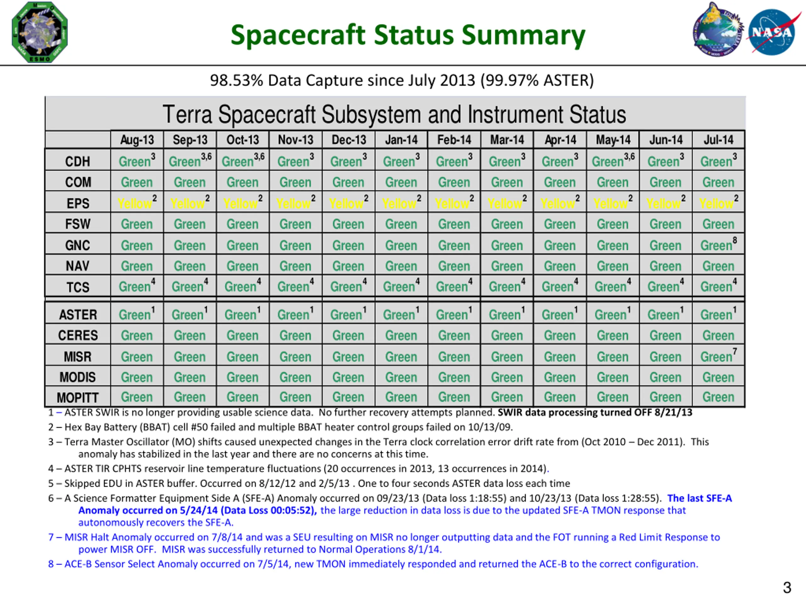 Spacecraft Status Summary 98.53% Data Capture since July 2013 (99.97% ASTER) Terra Spacecraft Subsystem and Instrument Status Aug-13 Green3 Green Yellow2 Green Green Green Green4 Sep-13 Green3,6 Green Yellow2 Green Green Green Green4 Oct-13 Green3,6 Green Yellow2 Green Green Green Green4 Nov-13 Green3 Green Yellow2 Green Green Green Green4 Dec-13 Green3 Green Yellow2 Green Green Green Green4 Jan-14 Green3 Green Yellow2 Green Green Green Green4 Feb-14 Green3 Green Yellow2 Green Green Green Green4 Mar-14 Green3 Green Yellow2 Green Green Green Green4 Apr-14 Green3 Green Yellow2 Green Green Green Green4 May-14 Green3,6 Green Yellow2 Green Green Green Green4 Jun-14 Green3 Green Yellow2 Green Green Green Green4 Jul-14 Green3 Green Yellow2 Green Green8 Green Green4 CDH COM EPS FSW GNC NAV TCS Green1 Green Green Green Green Green1 Green Green Green Green Green1 Green Green Green Green Green1 Green Green Green Green Green1 Green Green Green Green Green1 Green Green Green Green Green1 Green Green Green Green Green1 Green Green Green Green Green1 Green Green Green Green Green1 Green Green Green Green Green1 Green Green Green Green Green1 Green Green7 Green Green ASTER CERES MISR MODIS MOPITT 1 ASTER SWIR is no longer providing usable science data. No further recovery attempts planned. SWIR data processing turned OFF 8/21/13 2 Hex Bay Battery (BBAT) cell #50 failed and multiple BBAT heater control groups failed on 10/13/09. 3 Terra Master Oscillator (MO) shifts caused unexpected changes in the Terra clock correlation error drift rate from (Oct 2010 Dec 2011). This anomaly has stabilized in the last year and there are no concerns at this time. 4 ASTER TIR CPHTS reservoir line temperature fluctuations (20 occurrences in 2013, 13 occurrences in 2014). 5 Skipped EDU in ASTER buffer. Occurred on 8/12/12 and 2/5/13 . One to four seconds ASTER data loss each time 6 A Science Formatter Equipment Side A (SFE-A) Anomaly occurred on 09/23/13 (Data loss 1:18:55) and 10/23/13 (Data loss 1:28:55). The last SFE-A Anomaly occurred on 5/24/14 (Data Loss 00:05:52), the large reduction in data loss is due to the updated SFE-A TMON response that autonomously recovers the SFE-A. 7 MISR Halt Anomaly occurred on 7/8/14 and was a SEU resulting on MISR no longer outputting data and the FOT running a Red Limit Response to power MISR OFF. MISR was successfully returned to Normal Operations 8/1/14. 8 ACE-B Sensor Select Anomaly occurred on 7/5/14, new TMON immediately responded and returned the ACE-B to the correct configuration. 3