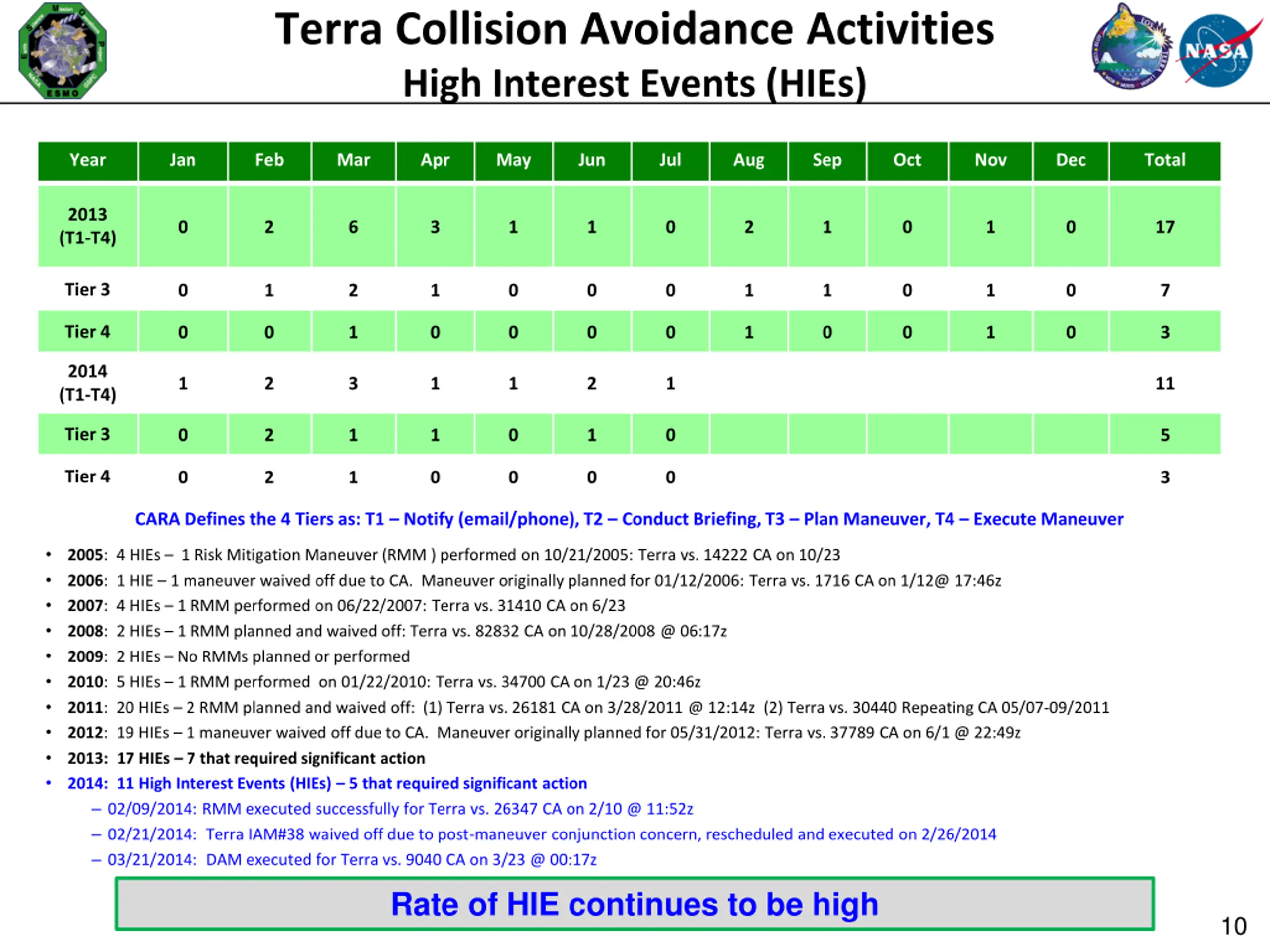 Terra Collision Avoidance Activities High Interest Events (HIEs) Year Jan Feb Mar Apr May Jun Jul Aug Sep Oct Nov Dec Total 2013 (T1-T4) 0 2 6 3 1 1 0 2 1 0 1 0 17 Tier 3 0 1 2 1 0 0 0 1 1 0 1 0 7 Tier 4 0 0 1 0 0 0 0 1 0 0 1 0 3 2014 (T1-T4) 1 2 3 1 1 2 1 11 Tier 3 0 2 1 1 0 1 0 5 Tier 4 0 2 1 0 0 0 0 3 CARA Defines the 4 Tiers as: T1 Notify (email/phone), T2 Conduct Briefing, T3 Plan Maneuver, T4 Execute Maneuver 2005: 4 HIEs 1 Risk Mitigation Maneuver (RMM ) performed on 10/21/2005: Terra vs. 14222 CA on 10/23 2006: 1 HIE 1 maneuver waived off due to CA. Maneuver originally planned for 01/12/2006: Terra vs. 1716 CA on 1/12@ 17:46z 2007: 4 HIEs 1 RMM performed on 06/22/2007: Terra vs. 31410 CA on 6/23 2008: 2 HIEs 1 RMM planned and waived off: Terra vs. 82832 CA on 10/28/2008 @ 06:17z 2009: 2 HIEs No RMMs planned or performed 2010: 5 HIEs 1 RMM performed on 01/22/2010: Terra vs. 34700 CA on 1/23 @ 20:46z 2011: 20 HIEs 2 RMM planned and waived off: (1) Terra vs. 26181 CA on 3/28/2011 @ 12:14z (2) Terra vs. 30440 Repeating CA 05/07-09/2011 2012: 19 HIEs 1 maneuver waived off due to CA. Maneuver originally planned for 05/31/2012: Terra vs. 37789 CA on 6/1 @ 22:49z 2013: 17 HIEs 7 that required significant action 2014: 11 High Interest Events (HIEs) 5 that required significant action 02/09/2014: RMM executed successfully for Terra vs. 26347 CA on 2/10 @ 11:52z 02/21/2014: Terra IAM#38 waived off due to post-maneuver conjunction concern, rescheduled and executed on 2/26/2014 03/21/2014: DAM executed for Terra vs. 9040 CA on 3/23 @ 00:17z Rate of HIE continues to be high 10