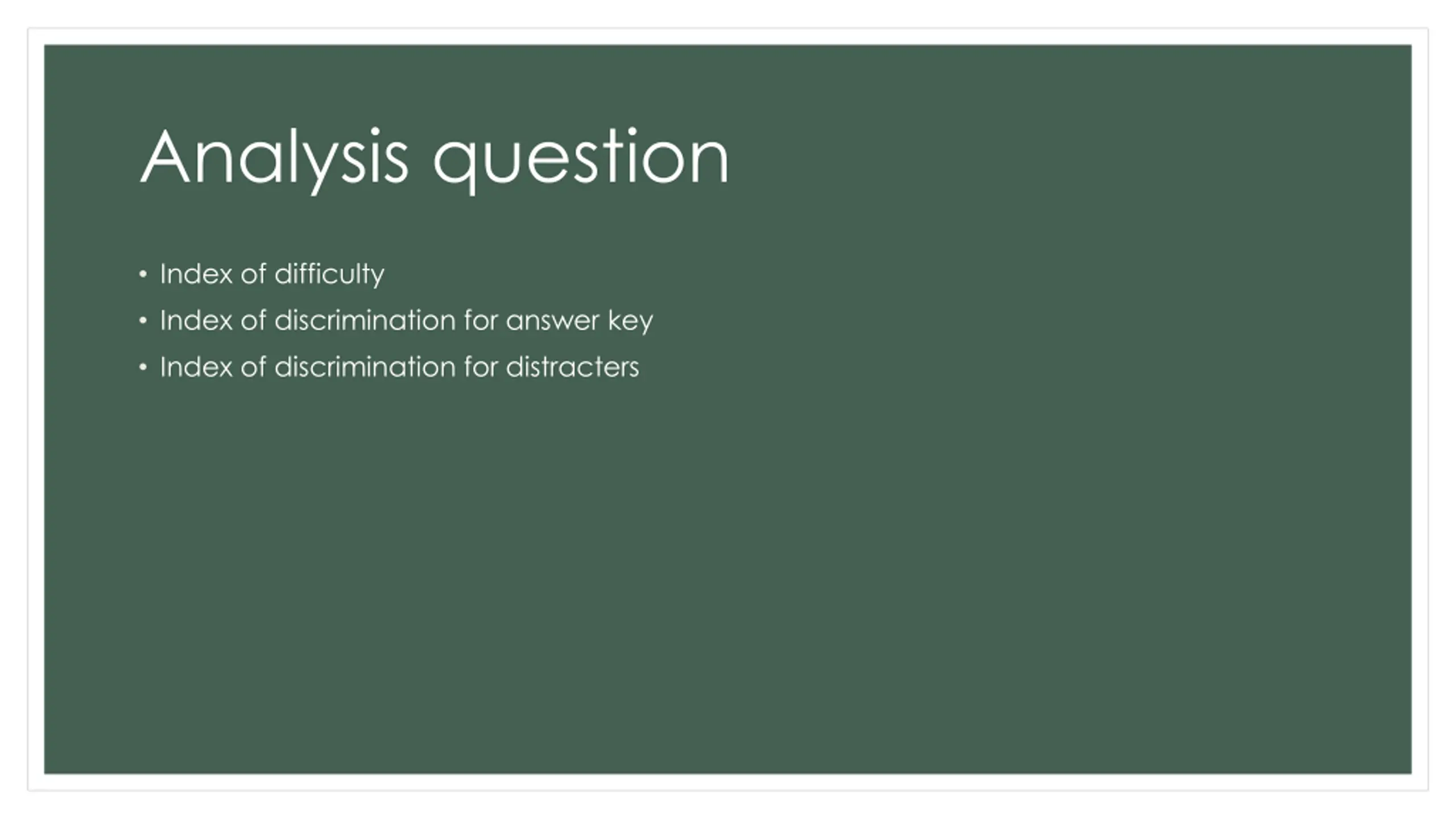 Analysis question Index of difficulty Index of discrimination for answer key Index of discrimination for distracters