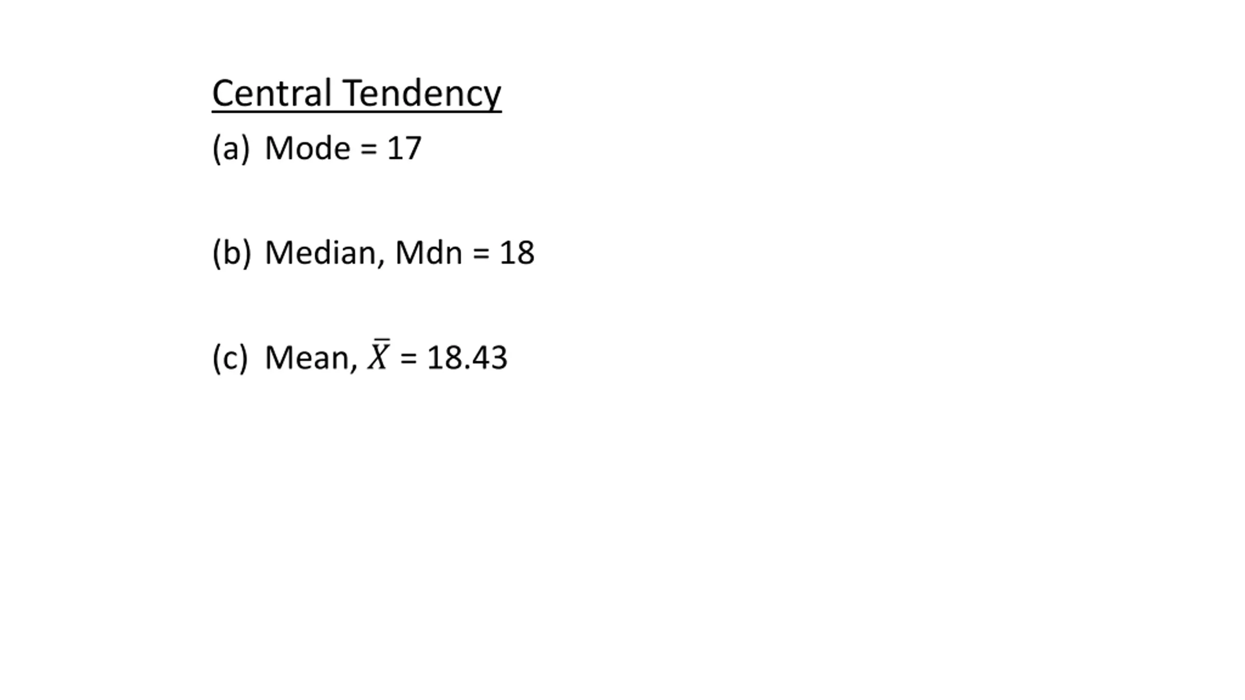 Central Tendency (a) Mode = 17 (b) Median, Mdn = 18 (c) Mean, ? = 18.43
