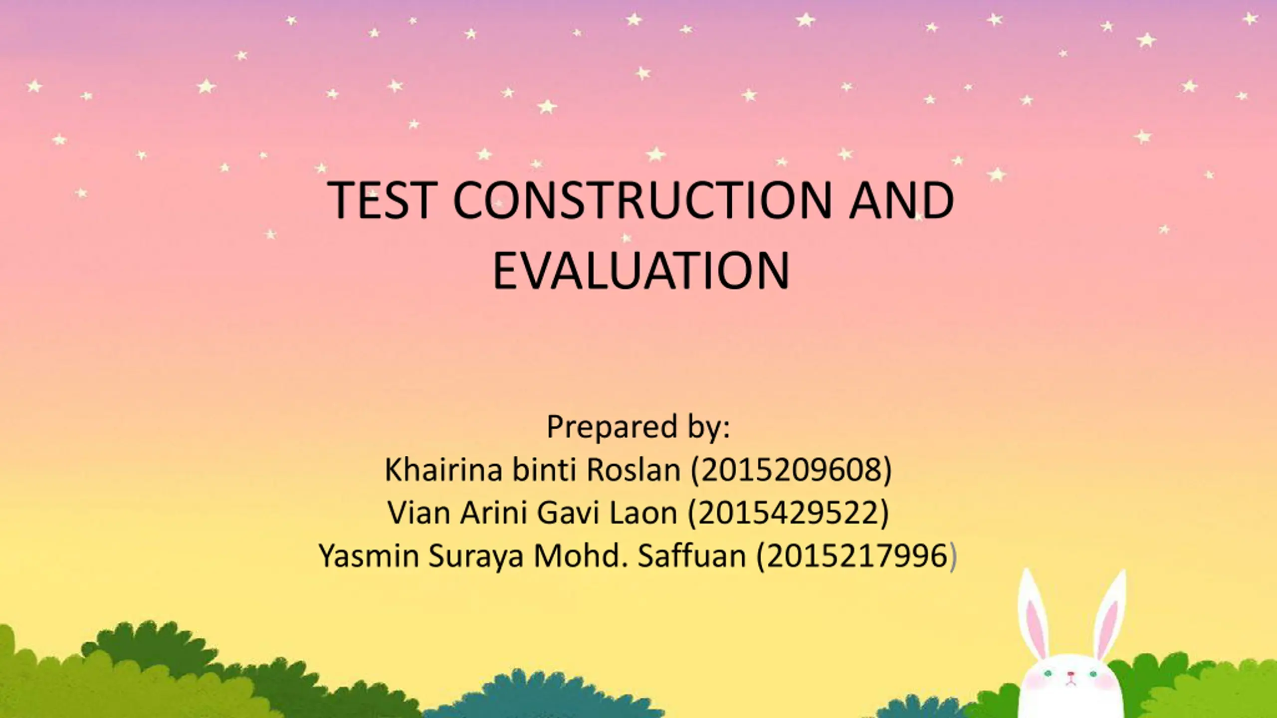 TEST CONSTRUCTION AND EVALUATION Prepared by: Khairina binti Roslan (2015209608) Vian Arini Gavi Laon (2015429522) Yasmin Suraya Mohd. Saffuan (2015217996)