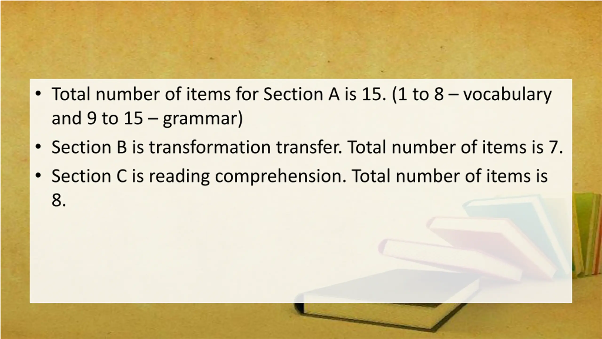Total number of items for Section A is 15. (1 to 8 vocabulary and 9 to 15 grammar) Section B is transformation transfer. Total number of items is 7. Section C is reading comprehension. Total number of items is 8.