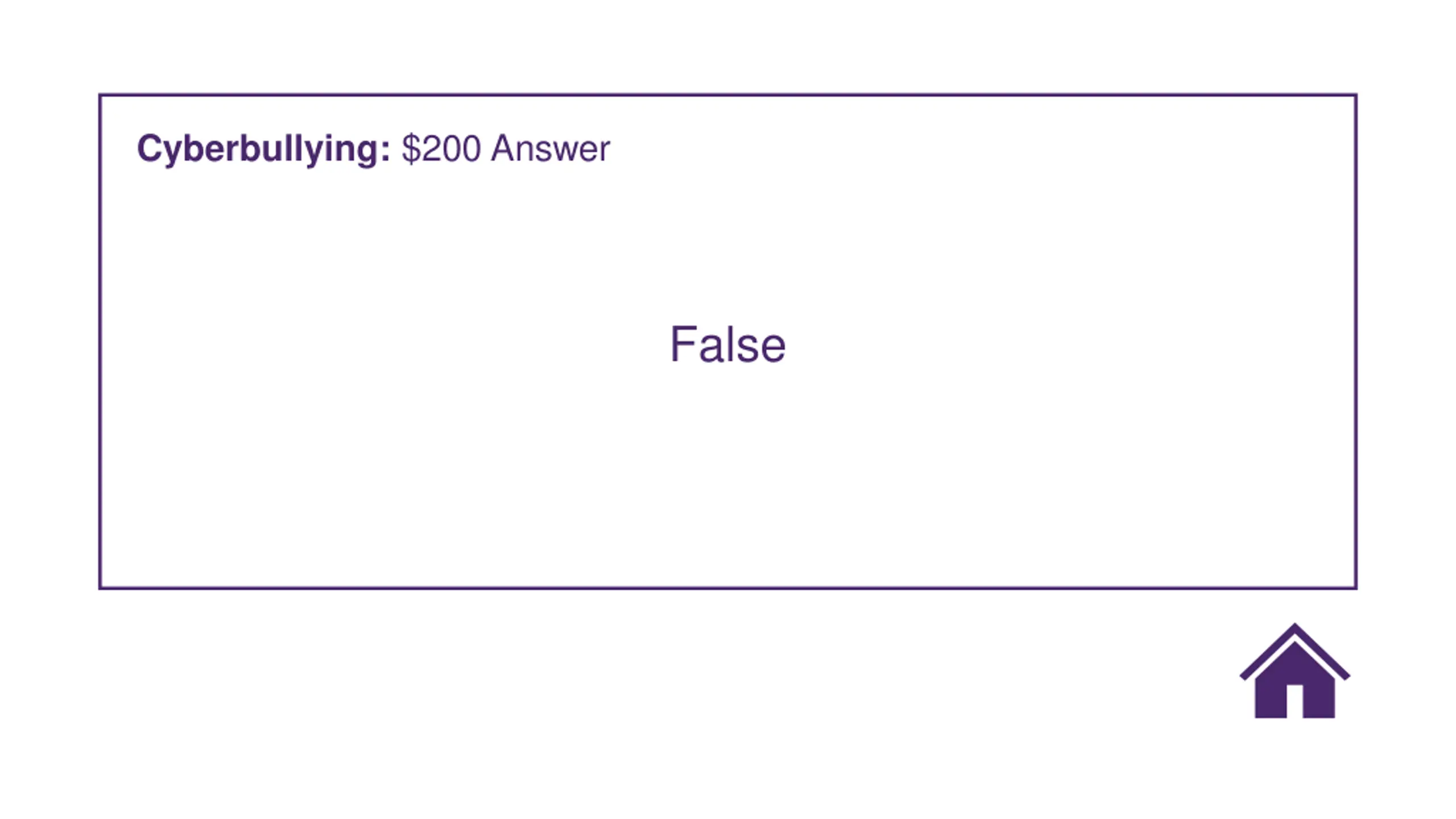 Put your digital citizenship skills to the test with Cyberbullying Jeopardy! Play individually or in groups, answer questions about cyberbullying, privacy, online safety, and more. Improve your online behavior knowledge while having fun!