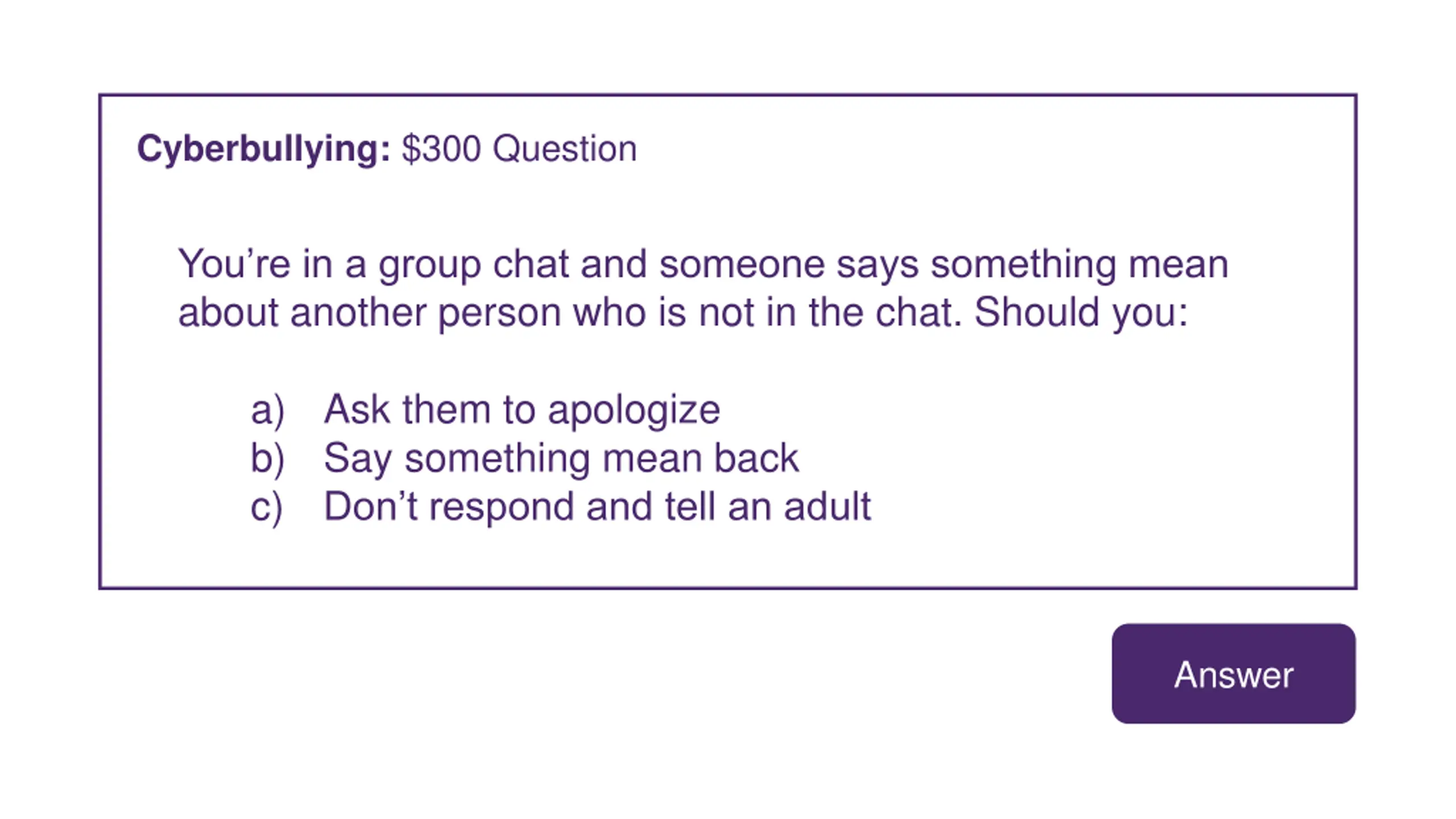 Cyberbullying: $300 Question You re in a group chat and someone says something mean about another person who is not in the chat. Should you: a) b) c) Ask them to apologize Say something mean back Don t respond and tell an adult Answer Answer