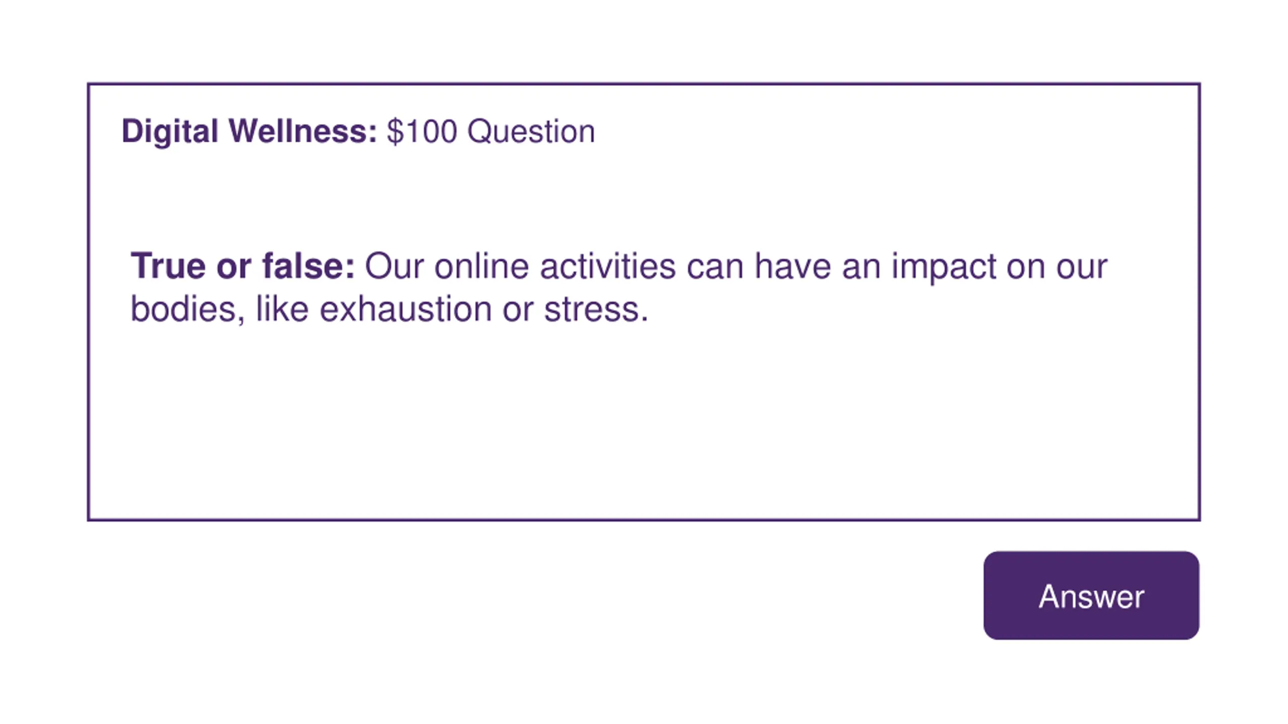 Digital Wellness: $100 Question True or false: Our online activities can have an impact on our bodies, like exhaustion or stress. Answer Answer