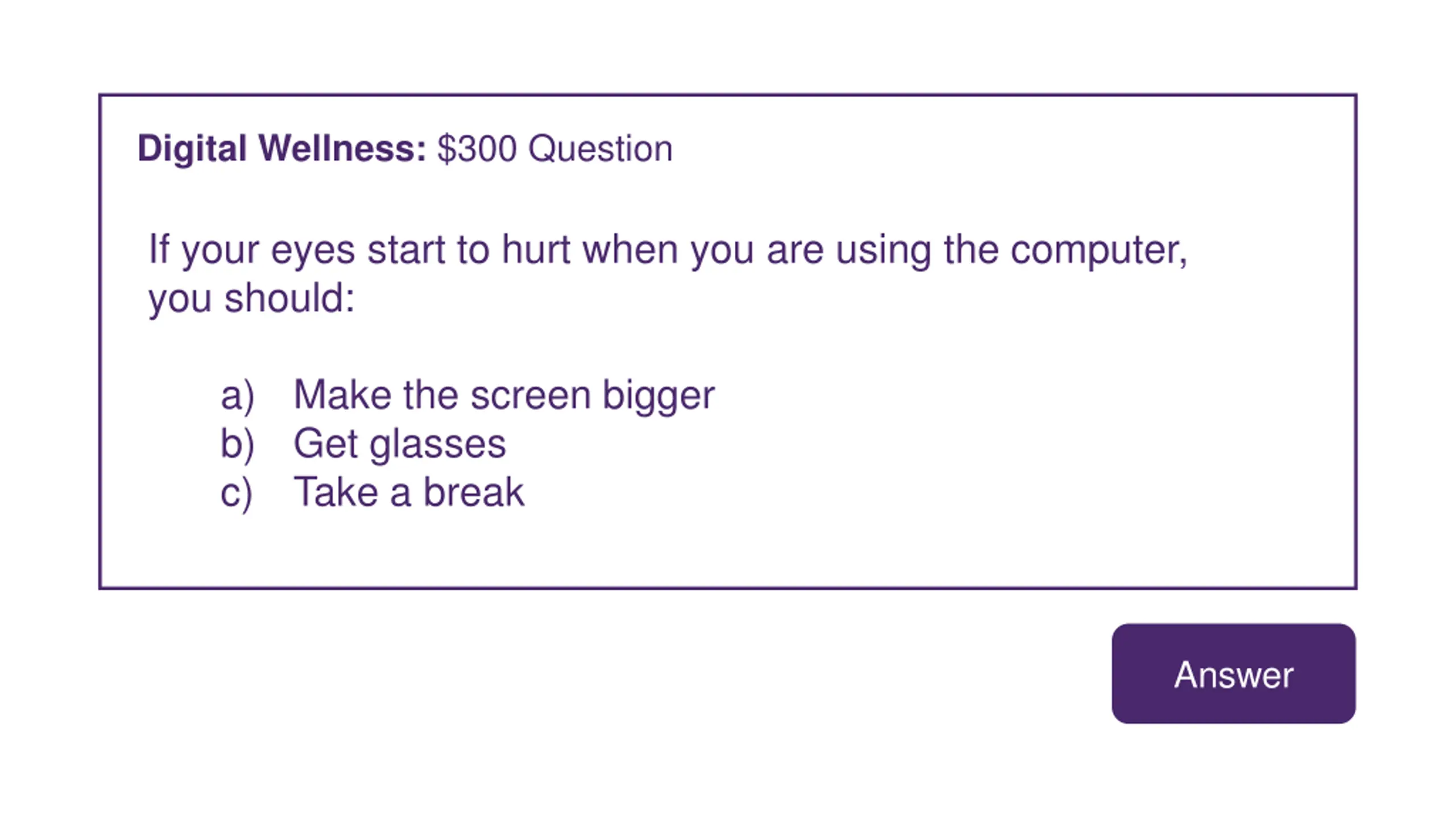 Digital Wellness: $300 Question If your eyes start to hurt when you are using the computer, you should: a) b) c) Make the screen bigger Get glasses Take a break Answer Answer