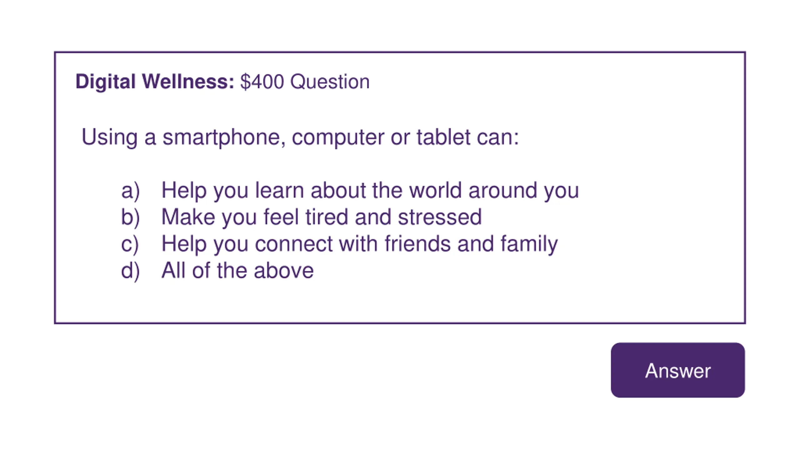 Digital Wellness: $400 Question Using a smartphone, computer or tablet can: a) b) c) d) Help you learn about the world around you Make you feel tired and stressed Help you connect with friends and family All of the above Answer Answer