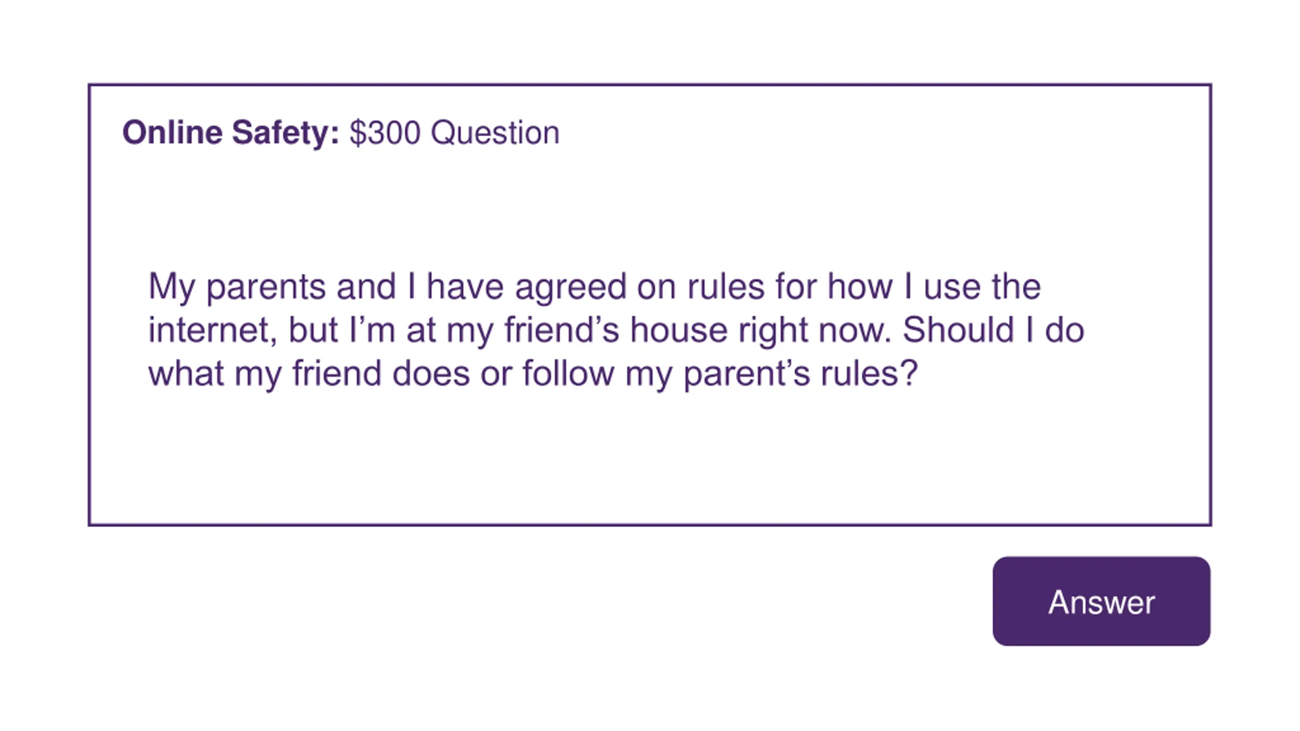 Online Safety: $300 Question My parents and I have agreed on rules for how I use the internet, but I m at my friend s house right now. Should I do what my friend does or follow my parent s rules? Answer Answer