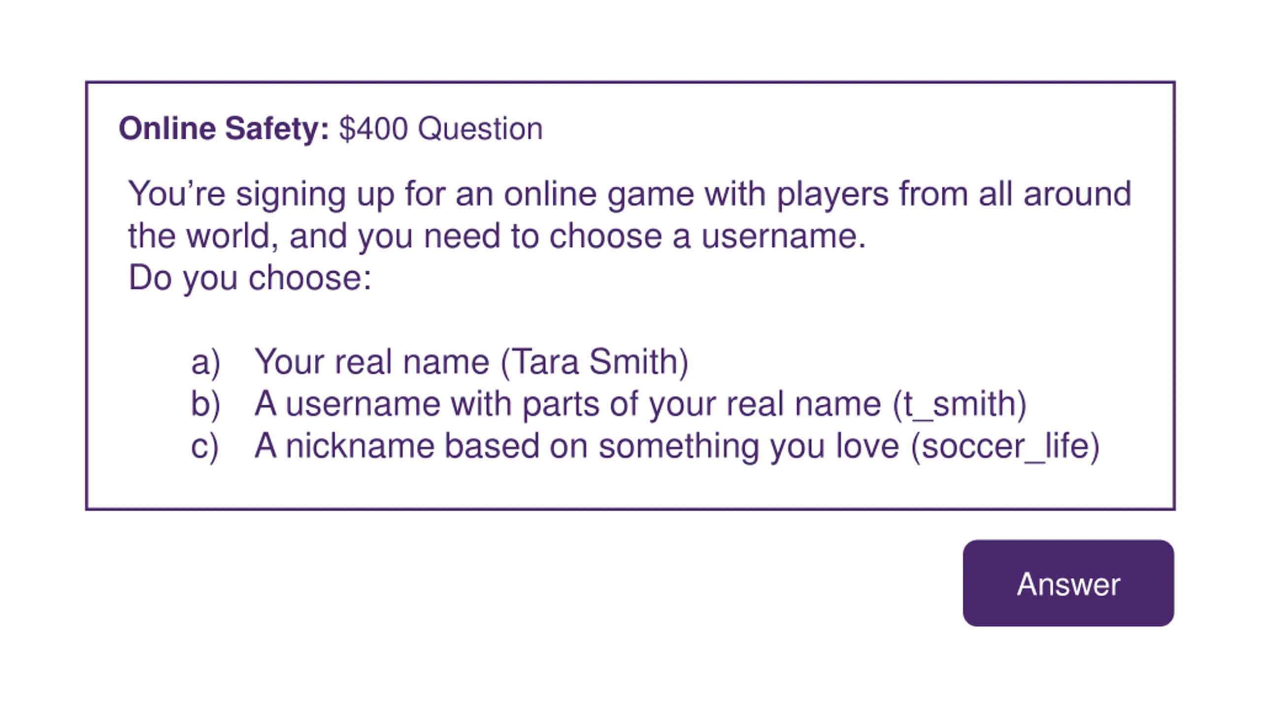 Online Safety: $400 Question You re signing up for an online game with players from all around the world, and you need to choose a username. Do you choose: a) b) c) Your real name (Tara Smith) A username with parts of your real name (t_smith) A nickname based on something you love (soccer_life) Answer Answer