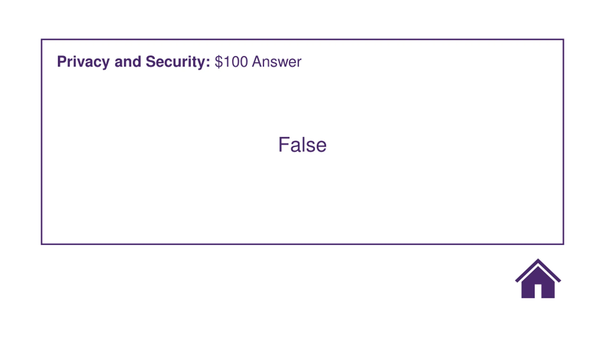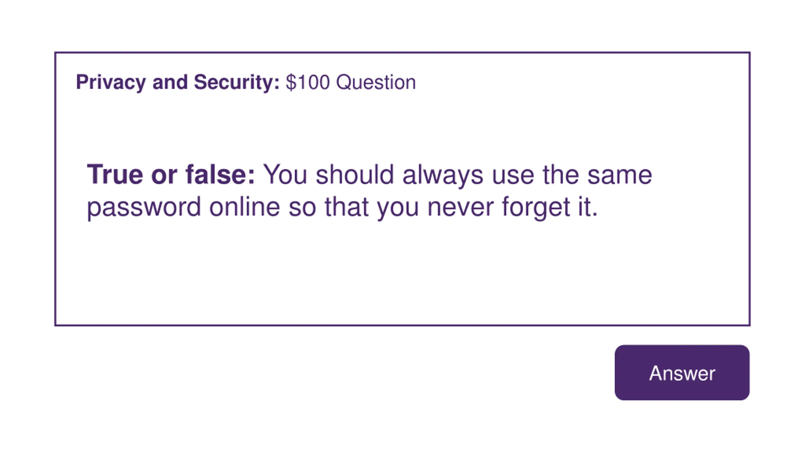 Privacy and Security: $100 Question True or false: You should always use the same password online so that you never forget it. Answer Answer
