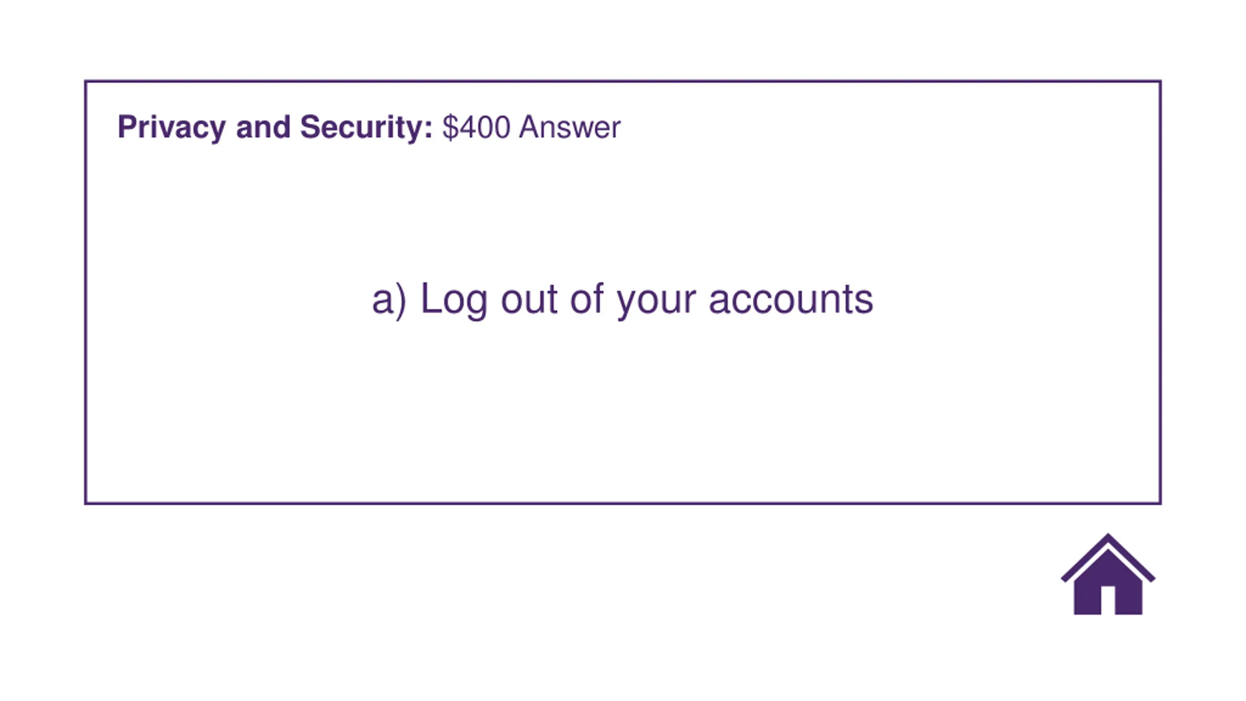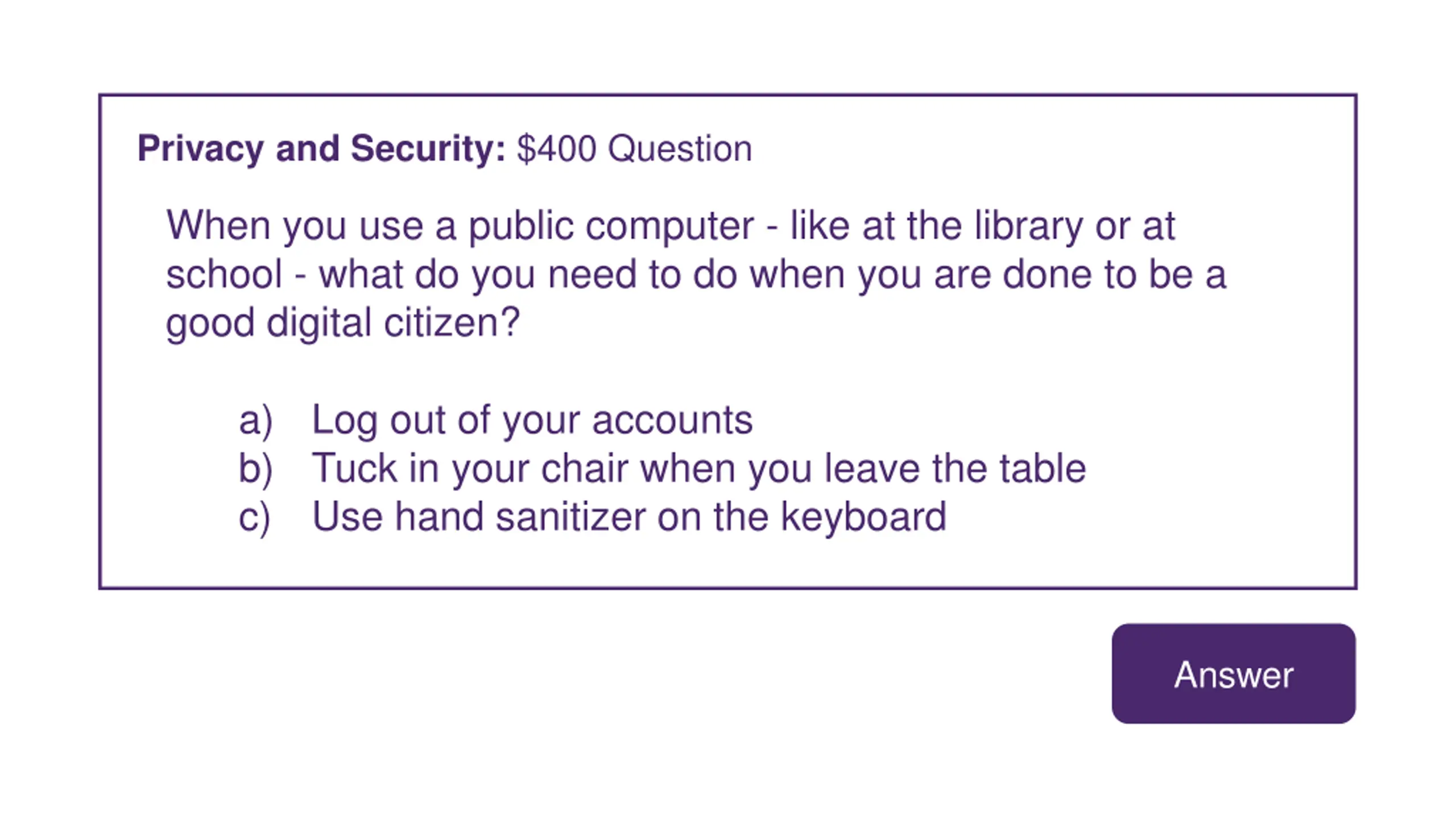 Privacy and Security: $400 Question When you use a public computer - like at the library or at school - what do you need to do when you are done to be a good digital citizen? a) b) c) Log out of your accounts Tuck in your chair when you leave the table Use hand sanitizer on the keyboard Answer Answer