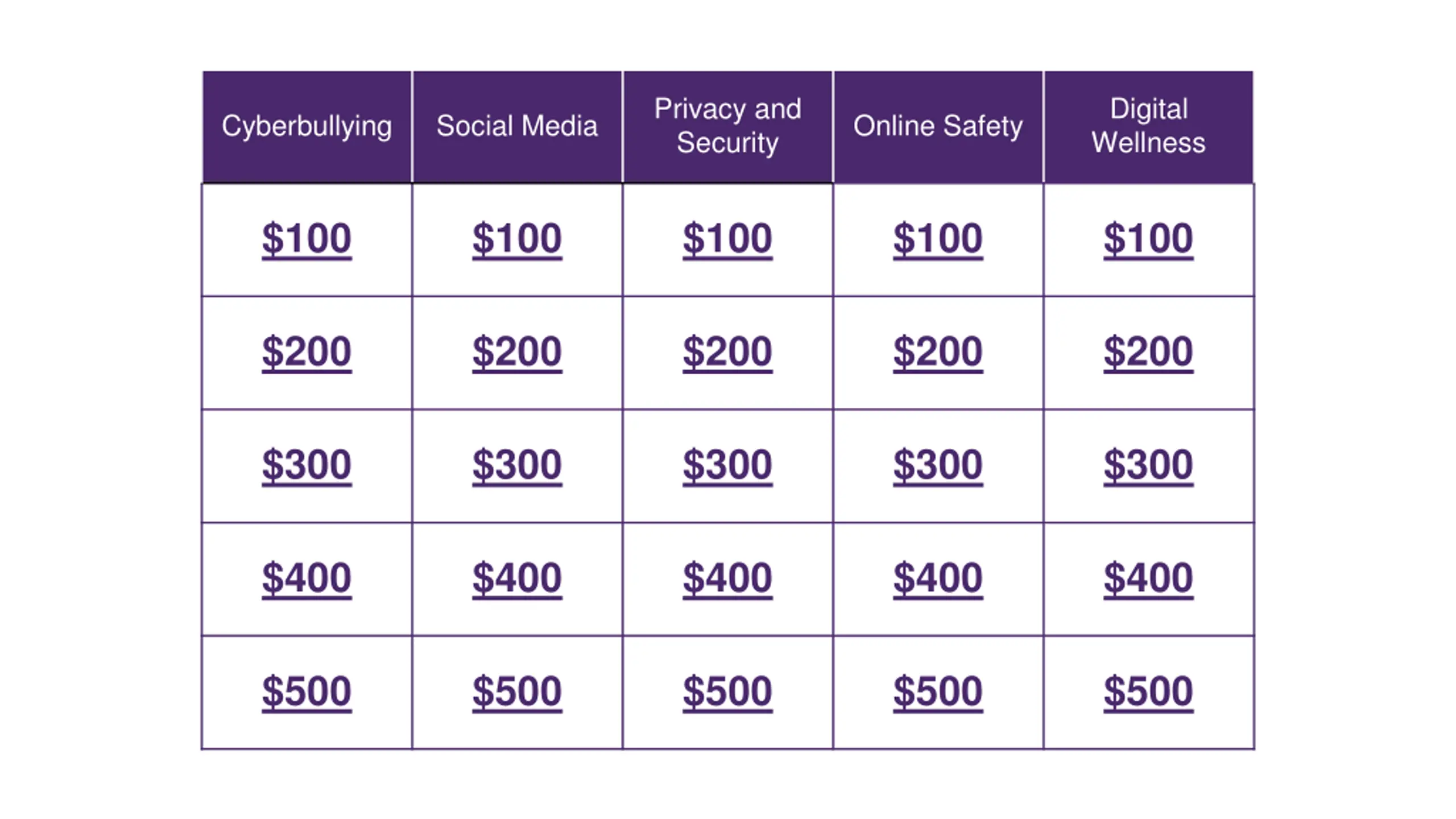 Privacy and Security Digital Wellness Cyberbullying Social Media Online Safety $100 $100 $100 $100 $100 $200 $200 $200 $200 $200 $300 $300 $300 $300 $300 $400 $400 $400 $400 $400 $500 $500 $500 $500 $500