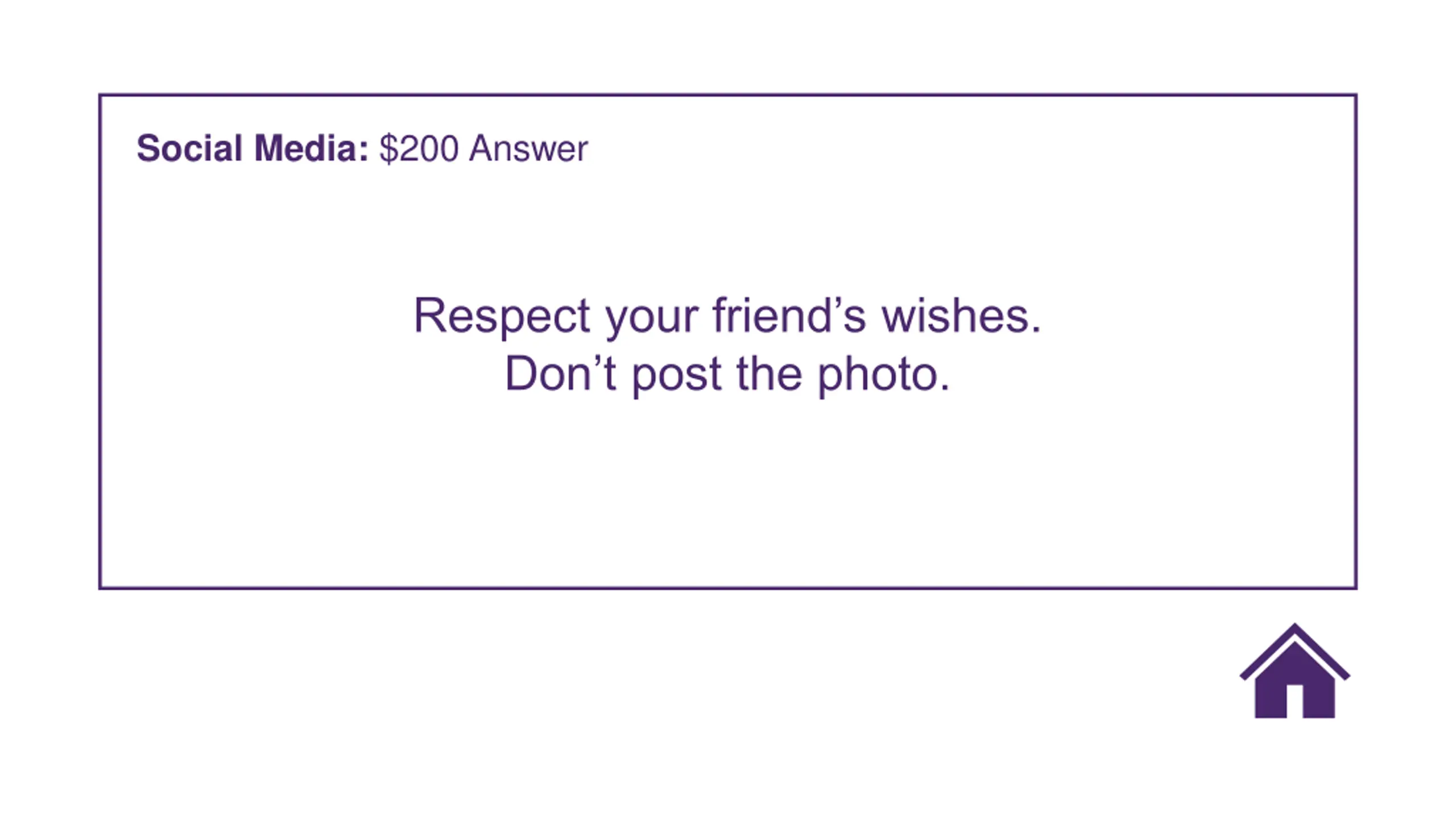 Social Media: $200 Answer Respect your friend s wishes. Don t post the photo. Home with solid fill