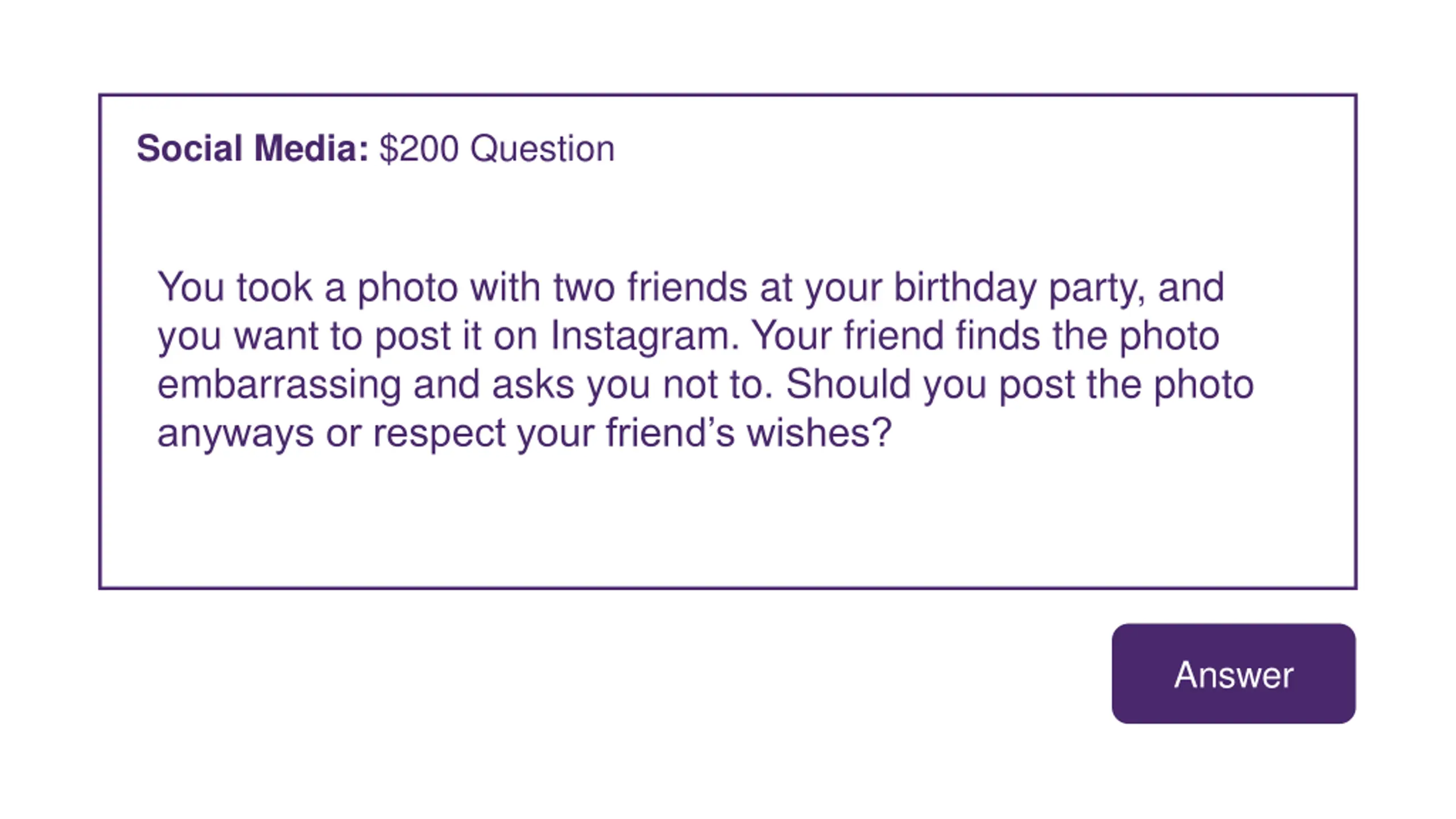 Social Media: $200 Question You took a photo with two friends at your birthday party, and you want to post it on Instagram. Your friend finds the photo embarrassing and asks you not to. Should you post the photo anyways or respect your friend s wishes? Answer Answer