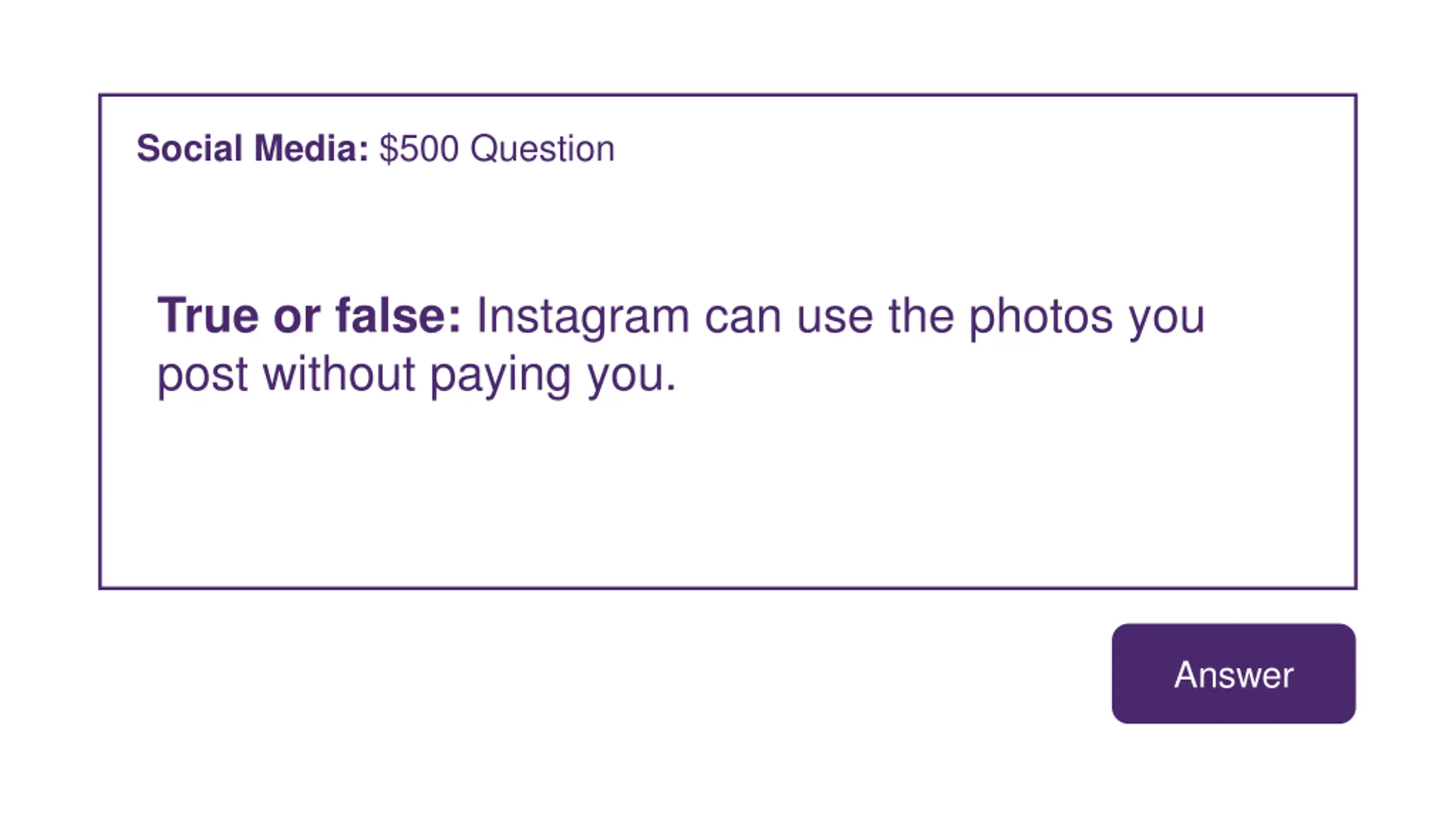 Social Media: $500 Question True or false: Instagram can use the photos you post without paying you. Answer Answer